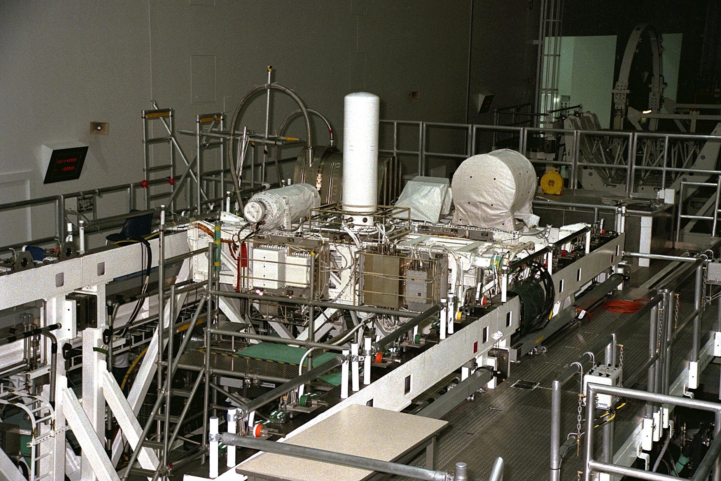 United States Microgravity Payload-4 (USMP-4) experiments are prepared to be flown on Space Shuttle mission STS-87 in the Space Station Processing Facility at Kennedy Space Center (KSC). Seen at right in the circular white cover is the Isothermal Dendritic Growth Experiment (IDGE), which will be used to study the dendritic solidification of molten materials in the microgravity environment. The large white vertical cylinder in the center of the photo is the Advanced Automated Directional Solidification Furnace (AADSF) and the horizontal tube to the left of it is MEPHISTO, a French acronym for a cooperative American-French investigation of the fundamentals of crystal growth. Just below MEPHISTO is the Space Acceleration Measurement System, or SAMS, which measures the microgravity conditions in which the experiments are conducted. The The metallic breadbox-like structure behind the AADSF is the Confined Helium Experiment (CHeX) that will study one of the basic influences on the behavior and properties of materials by using liquid helium confined between solid surfaces and microgravity. All of these experiments are scheduled for launch aboard STS-87 on Nov. 19 from KSC