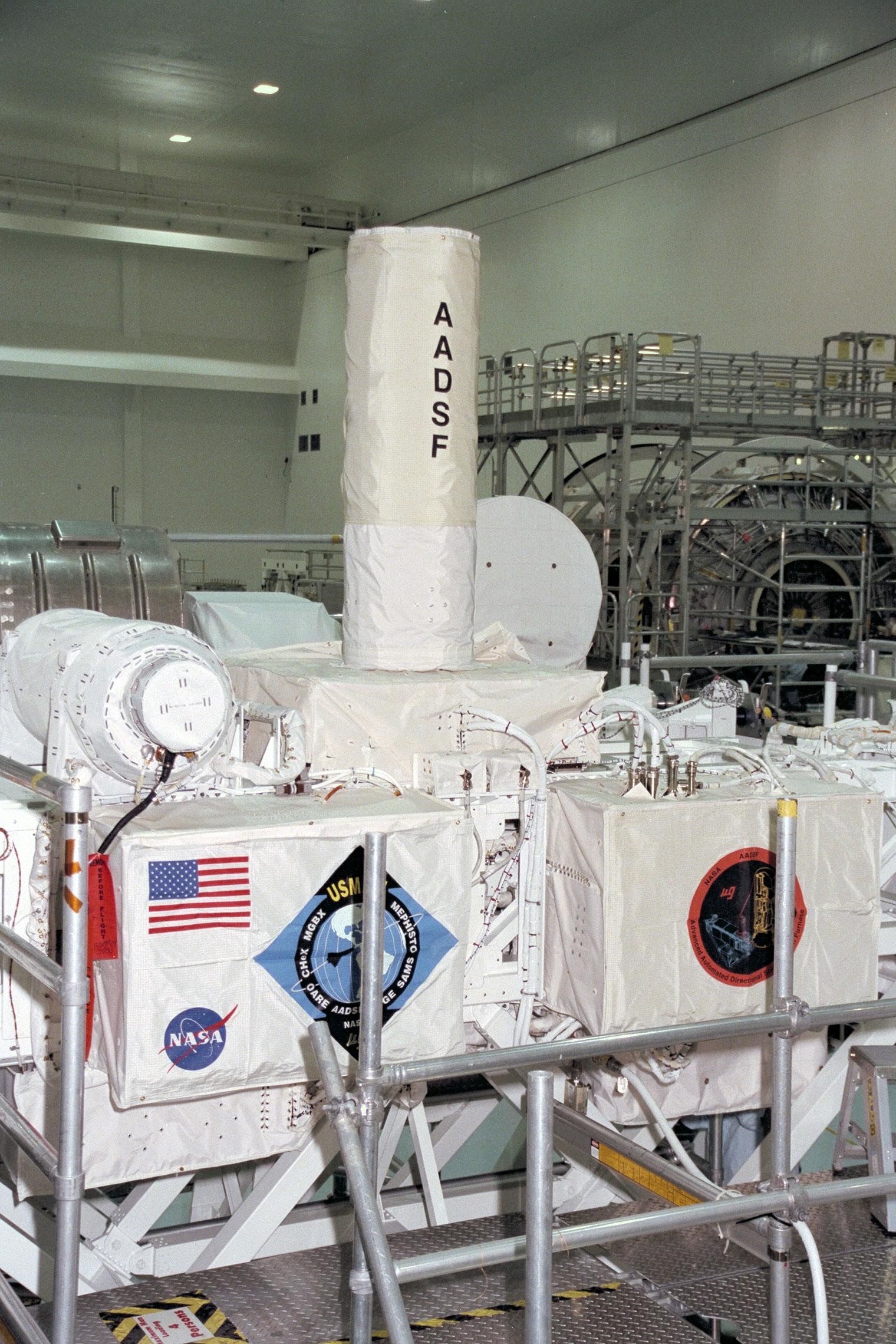United States Microgravity Payload-4 (USMP-4) experiments are prepared to be flown on Space Shuttle mission STS-87 in the Space Station Processing Facility at Kennedy Space Center (KSC). The large white vertical cylinder in the center of the photo is the Advanced Automated Directional Solidification Furnace (AADSF) and the horizontal tube to the left of it is MEPHISTO, a French acronym for a cooperative American-French investigation of the fundamentals of crystal growth. Seen at right behind the AADSF in the circular white cover is the Isothermal Dendritic Growth Experiment (IDGE), which will be used to study the dendritic solidification of molten materials in the microgravity environment. Under the multi-layer insulation with the American flag and mission logo is the Space Acceleration Measurement System, or SAMS, which measures the microgravity conditions in which the experiments are conducted. All of these experiments are scheduled for launch aboard STS-87 on Nov. 19 from KSC