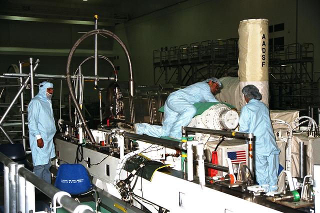 Technicians are monitoring experiments on the United States Microgravity Payload-4 (USMP-4) in preparation for its scheduled launch aboard STS-87 on Nov. 19 from Kennedy Space Center (KSC). USMP-4 experiments are prepared in the Space Station Processing Facility at KSC. The large white vertical cylinder at the right of the photo is the Advanced Automated Directional Solidification Furnace (AADSF ), which is a sophisticated materials science facility used for studying a common method of processing semiconductor crystals called directional solidification. The technician in the middle of the photo is leaning over MEPHISTO, a cooperative American-French investigation of the fundamentals of crystal growth