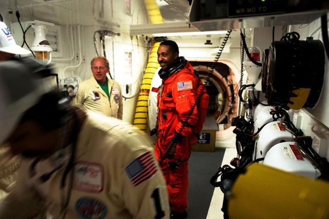 STS-87 Mission Specialist Winston Scott is assisted with his ascent and re-entry flight suit in the white room at Launch Pad 39B by Danny Wyatt, NASA quality assurance specialist. STS-87 is the fourth flight of the United States Microgravity Payload and Spartan-201. Scott is scheduled to perform an extravehicular activity spacewalk with Mission Specialist Takao Doi, Ph.D., of the National Space Development Agency of Japan, during STS-87. Scott also performed a spacewalk on the STS-72 mission