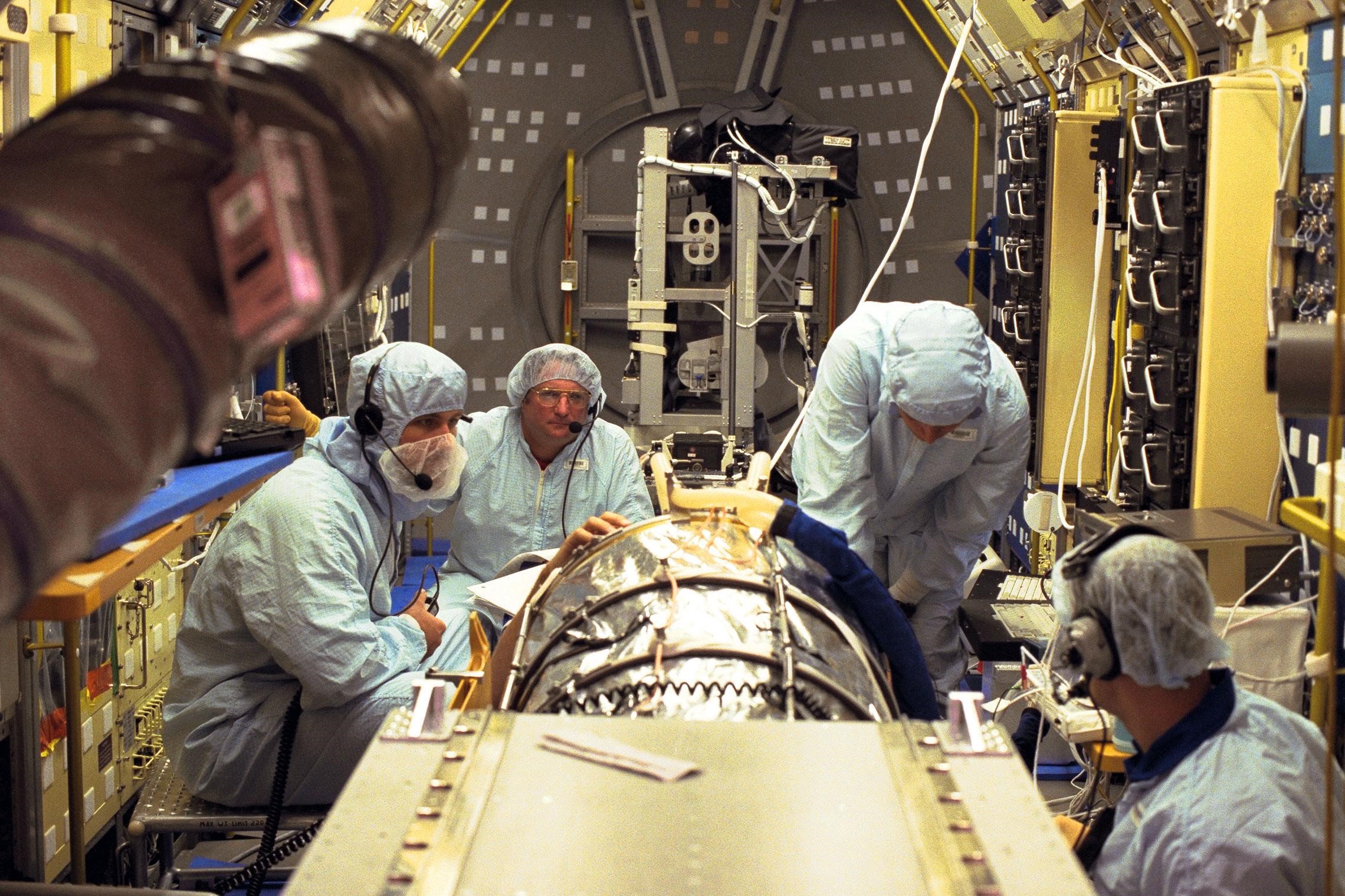 The Neurolab payload for STS-90, scheduled to launch aboard the Shuttle Columbia from Kennedy Space Center (KSC) on April 2, 1998, undergoes further processing in the Operations and Checkout Building at KSC. Investigations during the Neurolab mission will focus on the effects of microgravity on the nervous system. Specifically, experiments will study the adaptation of the vestibular system, the central nervous system, and the pathways that control the ability to sense location in the absence of gravity, as well as the effect of microgravity on a developing nervous system. The crew of STS-90 will include Commander Richard Searfoss, Pilot Scott Altman, Mission Specialists Richard Linnehan, Dafydd (Dave) Williams, M.D., and Kathryn (Kay) Hire, and Payload Specialists Jay Buckey, M.D., and James Pawelczyk, Ph.D