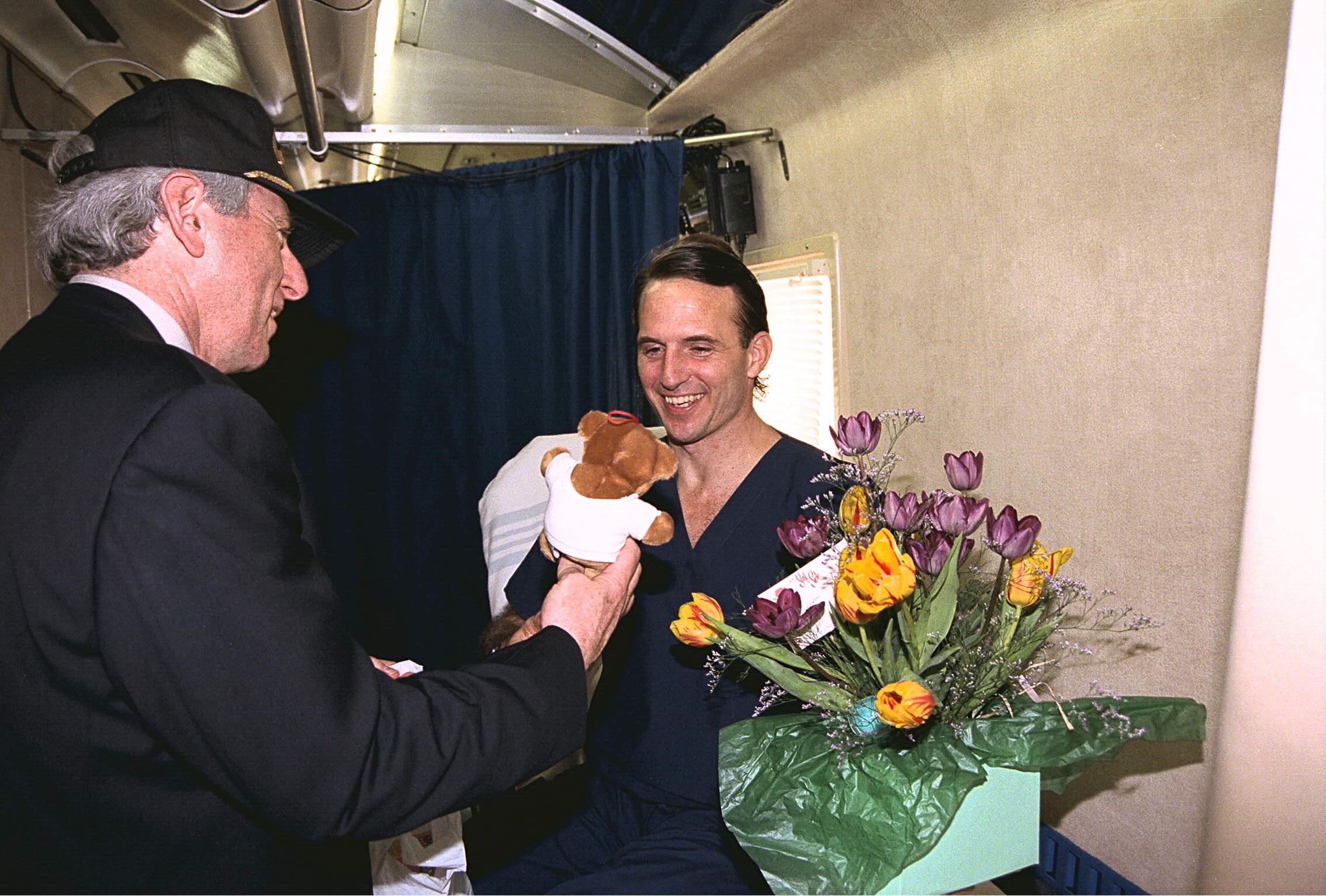 NASA Administrator Daniel Goldin presents some gifts to returning astronaut Jerry M. Linenger, who spent the last four months on the Russian Space Station Mir. Goldin met with Linenger in the Crew Transport Vehicle shortly after the Space Shuttle orbiter Atlantis landed on Runway 33 of KSC’s Shuttle Landing Facility at the conclusion of the nine-day STS-84 mission. Goldin gave the astronaut flowers for Linenger’s wife, Kathryn; a stuffed bear for their 18-month-old son, John; and a rattle for their unborn child who is due next month. STS-84 was the sixth of nine planned dockings of the Space Shuttle with the Mir. Mir 23 crew member Linenger was replaced on the Russian space station by STS-84 Mission Specialist C. Michael Foale