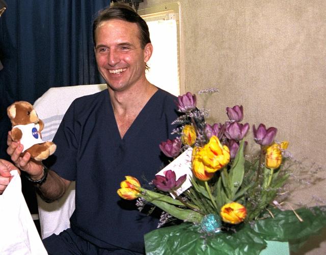 Astronaut and recent Mir 23 crew member Jerry M. Linenger holds a stuffed bear he was given by NASA Administrator Daniel Goldin at the conclusion of the STS-84 Space Shuttle mission. STS-84 was the sixth docking of the Shuttle with the Russian Space Station Mir, where Linenger has lived and worked the past four months. Goldin presented several gifts to Linenger in the Crew Transport Vehicle shortly after landing of the Space Shuttle orbiter Atlantis on KSC’s Runway 33. Besides the bear for Linenger’s 18-month-old son, John, Goldin gave the astronaut flowers for Linenger’s wife, Kathryn; and a rattle for the Linengers’ unborn child who is due next month. Linenger was replaced on the Russian space station by STS-84 Mission Specialist C. Michael Foale