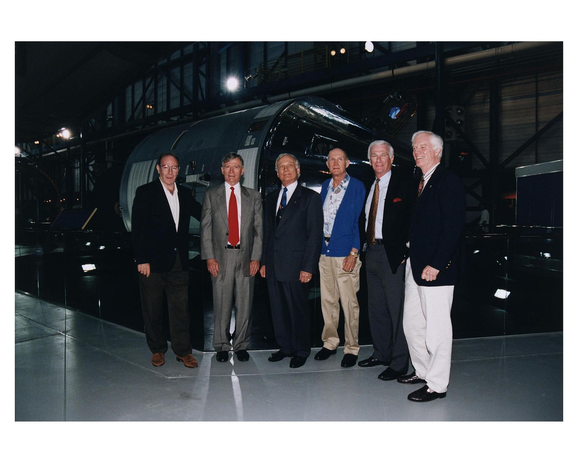 KENNEDY SPACE CENTER, FLA. -- Some of the former Apollo program astronauts pose in front of an Apollo Command and Service Module during a tour the new Apollo/Saturn V Center (ASVC) at KSC prior to the gala grand opening ceremony for the facility that was held Jan. 8, 1997. The astronauts were invited to participate in the event, which also featured NASA Administrator Dan Goldin and KSC Director Jay Honeycutt. The astronauts are (from left): Apollo 14 Lunar Module Pilot Edgar D. Mitchell; Apollo 10 Command Module Pilot and Apollo 16 Commander John W. Young; Apollo 11 Lunar Module Pilot Edwin E. "Buzz" Aldrin, Jr.; Apollo 10 Commander Thomas P. Stafford; Apollo 10 Lunar Module Pilot and Apollo 17 Commander Eugene A. Cernan; and Apollo 9 Lunar Module Pilot Russell L. Schweikart. The ASVC also features several other Apollo program spacecraft components, multimedia presentations and a simulated Apollo/Saturn V liftoff. The facility will be a part of the KSC bus tour that embarks from the KSC Visitor Center