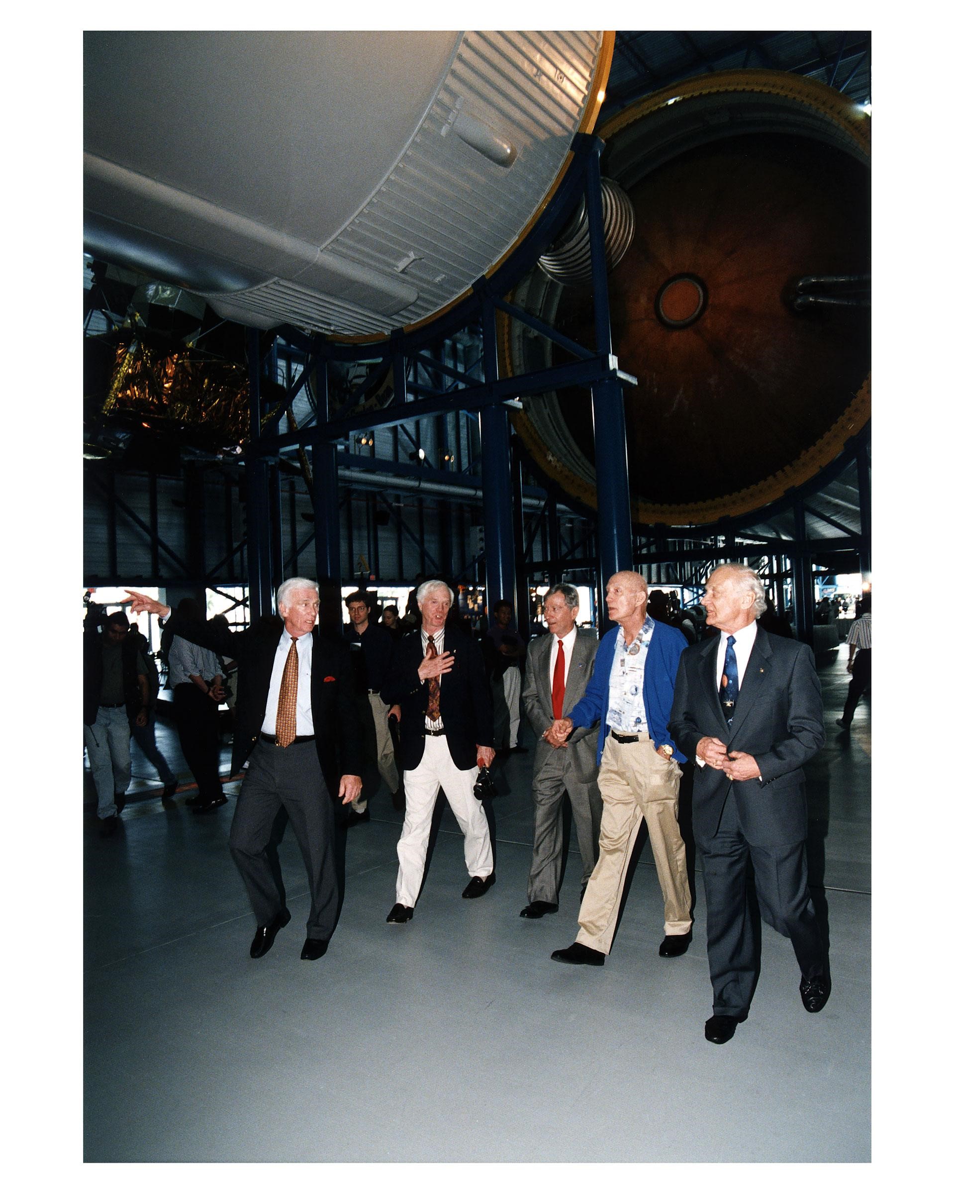 KENNEDY SPACE CENTER, FLA. -- Some of the former Apollo program astronauts tour the new Apollo/Saturn V Center (ASVC) at KSC prior to the gala grand opening ceremony for the facility that was held Jan. 8, 1997. The astronauts were invited to participate in the event, which also featured NASA Administrator Dan Goldin and KSC Director Jay Honeycutt. Passing underneath the KSC Apollo/Saturn V inside the building are (from left): Apollo 10 Lunar Module Pilot and Apollo 17 Commander Eugene A. Cernan; Apollo 9 Lunar Module Pilot Russell L. Schweikart; Apollo 10 Command Module Pilot and Apollo 16 Commander John W. Young; Apollo 10 Commander Thomas P. Stafford; and Apollo 11 Lunar Module Pilot Edwin E. "Buzz" Aldrin, Jr. The ASVC also features several other Apollo program spacecraft components, multimedia presentations and a simulated Apollo/Saturn V liftoff. The facility will be a part of the KSC bus tour that embarks from the KSC Visitor Center