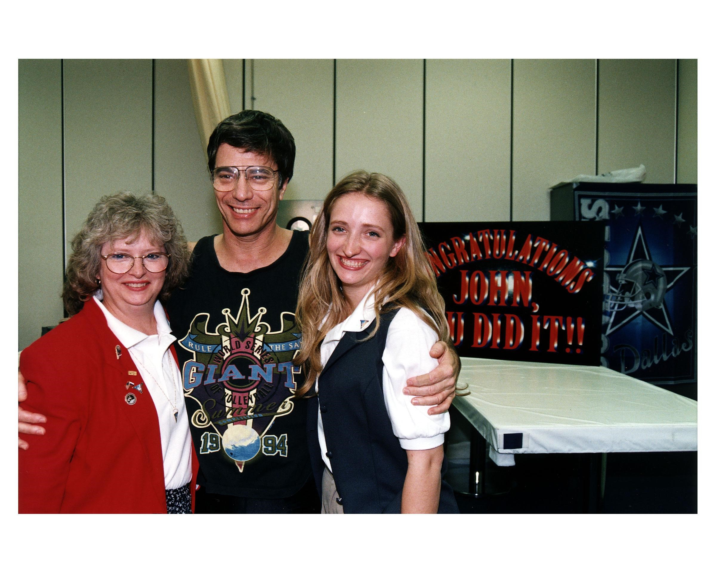 U. S. astronaut John E. Blaha and his family are all smiles as they embrace in the crew quarters at KSC after he answered questions about his four-month stay aboard the Russian Mir space station. Blaha’s wife, Brenda, is on the left and his daughter, Carolyn, is on the right. Blaha returned to Earth earlier today aboard the Space Shuttle orbiter Atlantis when it touched down at 9:22:44 a.m. EST Jan. 22 on Runway 33 of KSC’s Shuttle Landing Facility at the conclusion of the STS-81 mission. Blaha and the other five returning STS-81 crew members are spending the night here in the Operations and Checkout Building before returning to Johnson Space Center in Houston tomorrow morning. Blaha will undergo a two-week series of medical tests to help determine the physiological effects of his long-duration mission