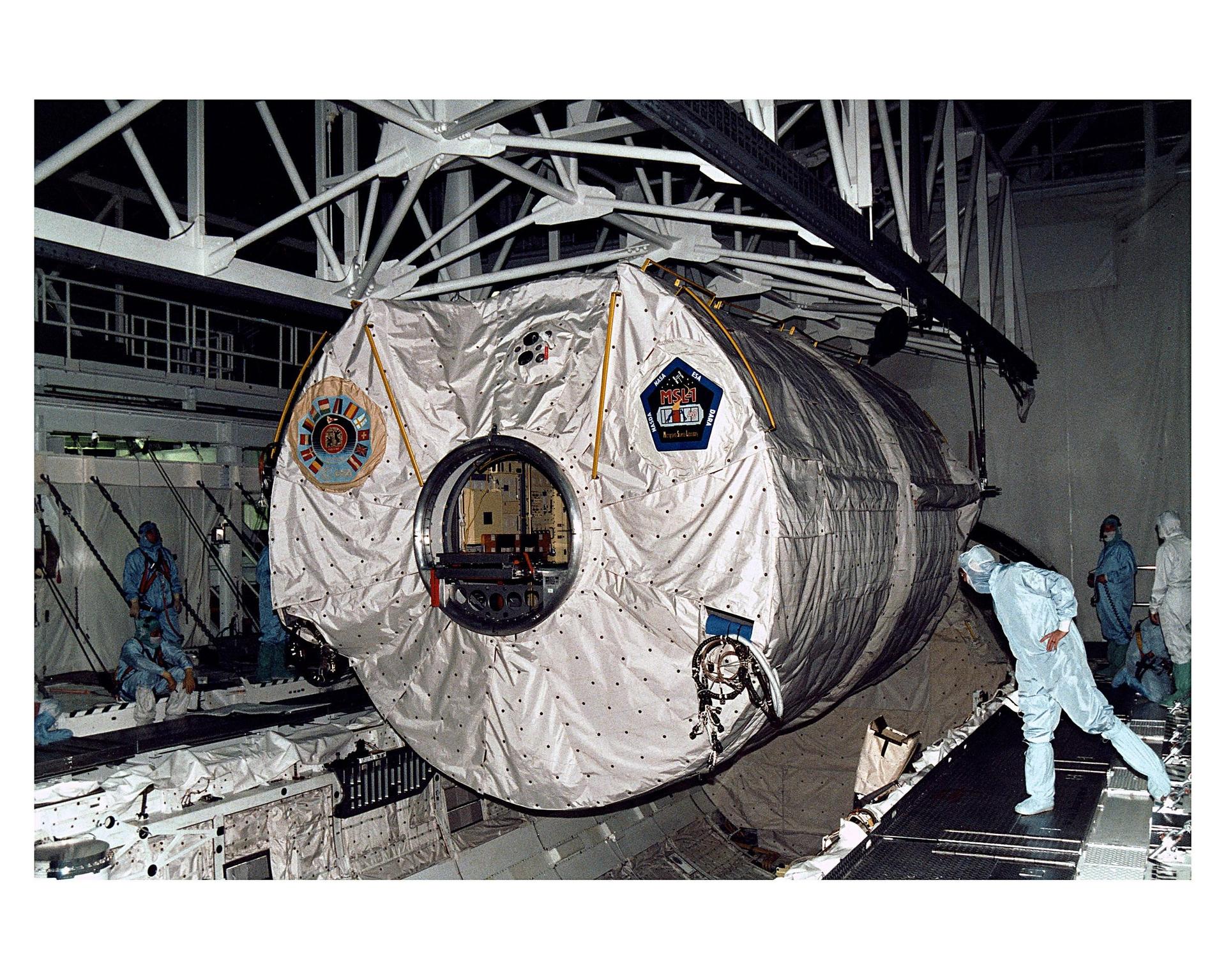 The Microgravity Science Laboratory-1 (MSL-1) Spacelab module is lowered into the payload bay of the Space Shuttle orbiter Columbia in Orbiter Processing Facility 1. During the scheduled 16-day STS-83 mission, the MSL-1 will be used to test some of the hardware, facilities and procedures that are planned for use on the International Space Station while the flight crew conducts combustion, protein crystal growth and materials processing experiments