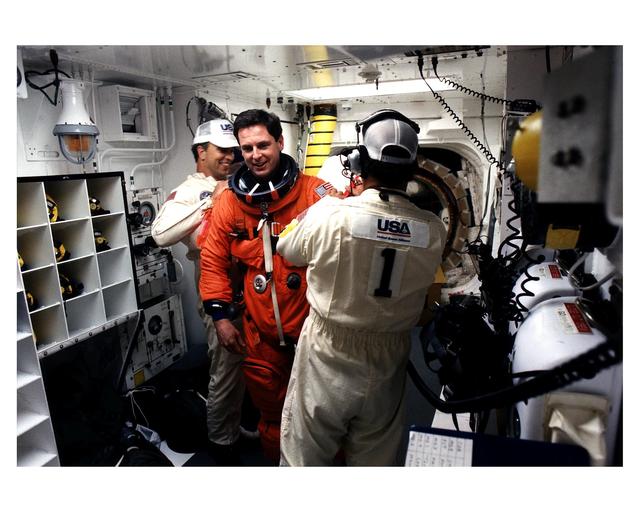 STS-82 Mission Specialist Gregory J. Harbaugh prepares to enter the Space Shuttle Discovery at Launch Pad 39A, with the assistance of white room closeout crew members Dave Law, at left, and Travis Thompson