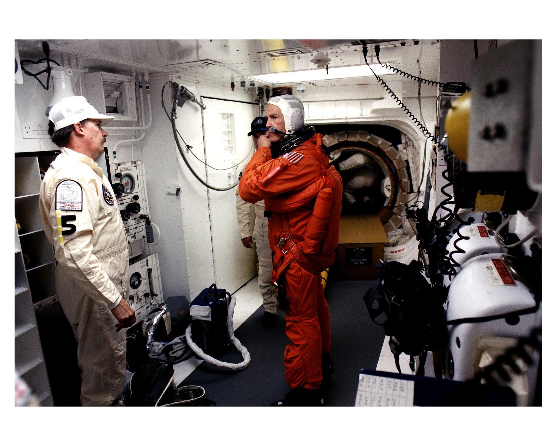 As white room closeout members look on, STS-82 Payload Commander Mark. C. Lee prepares to enter the Space Shuttle Discovery at Launch Pad 39A
