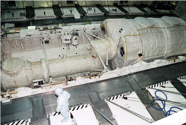 KENNEDY SPACE CENTER, FLA. - The Microgravity Science Laboratory-1 (MSL-1) Spacelab module is installed into the payload bay of the Space Shuttle Orbiter Columbia in Orbiter Processing Facility 1. The Spacelab long crew transfer tunnel that leads from the orbiter's crew airlock to the module is also aboard, as well as the Hitchhiker Cryogenic Flexible Diode (CRYOFD) experiment payload, which is attached to the right side of Columbia's payload bay. During the scheduled 16-day STS-83 mission, the MSL-1 will be used to test some of the hardware, facilities and procedures that are planned for use on the International Space Station while the flight crew conducts combustion, protein crystal growth and materials processing experiments.