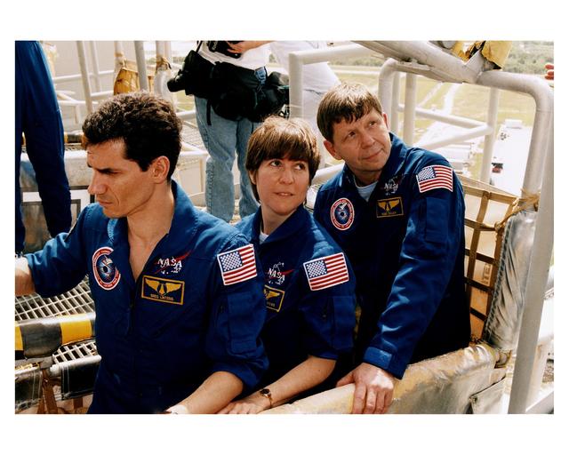 STS-83 Payload Specialist Gregory T. Linteris, Mission Specialist Janice E. Voss, and Payload Specialist Roger K. Crouch participate in emergency egress training at Launch Complex 39A during the crew's <a href="http://www-pao.ksc.nasa.gov/kscpao/release/1997/40-97.htm">Terminal Countdown Demonstration Test (TCDT).</a> They are seen here in one of the pads' seven <a href="http://www-pao.ksc.nasa.gov/kscpao/nasafact/pads.htm#emergenc">slidewire baskets.</a