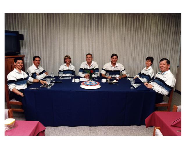 The STS-83 flight crew enjoys the traditional pre-liftoff breakfast in the crew quarters of the Operations and Checkout Building. They are (from left): Payload Specialist Gregory T. Linteris; Mission Specialist Donald A. Thomas; Pilot Susan L. Still; Mission Commander James D. Halsell, Jr.; Mission Specialist Michael L. Gernhardt; Payload Commander Janice E. Voss; and Payload Specialist Roger K. Crouch. After a weather briefing, the flight crew will be fitted with their launch/entry suits and depart for Launch Pad 39A. Once there, they will take their positions in the crew cabin of the Space Shuttle Columbia to await a liftoff during a window that will open at 2:00 p.m. EST, April 4