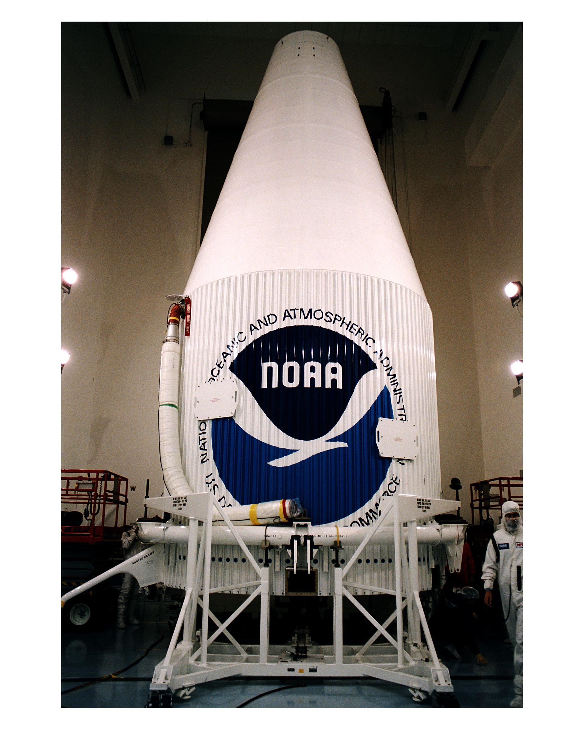 The Atlas 1 payload fairing with the encapsulated GOES-K advanced weather satellite awaits transport to the launch pad. GOES-K was prepared for launch at the Astrotech Space Operations LP facility in Titusville. GOES-K will be the third spacecraft to be launched in the advanced series of Geostationary Operational Environmental Satellites (GOES). The GOES satellites are owned and operated by the National Oceanic and Atmospheric Administration (NOAA); NASA manages the design, development and launch of the spacecraft. GOES-K is targeted for an <a href="http://www-pao.ksc.nasa.gov/kscpao/release/1997/63-97.htm">April 24 launch</a> aboard a Lockheed Martin Atlas 1 expendable launch vehicle (AC-79) from Launch Complex 36, Pad B, Cape Canaveral Air Station. The launch window opens at 1:50 a.m. and extends to 3:09 a.m. EDT. Once in orbit, GOES-K will become GOES-10, joining GOES-8 and GOES-9 in space