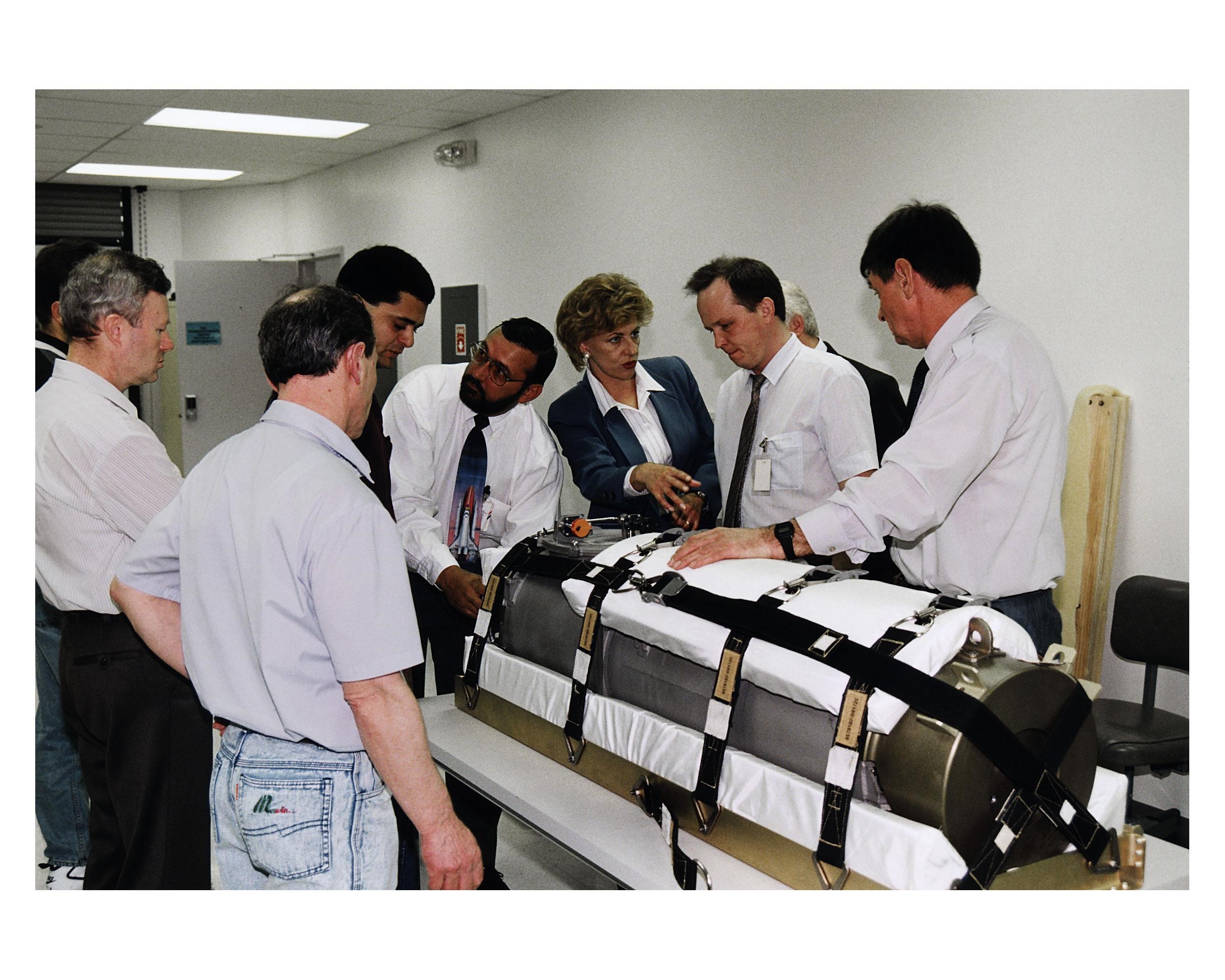Representatives of RSC Energia in Russia and other onlookers in the SPACEHAB Payload Processing Facility examine an oxygen generator which the Space Shuttle Atlantis will carry to the Russian Mir Space Station on Mission STS-84. Sergei Romanov, second from right in the white shirt, is the spokesperson for generator manufacturer RSC Energia. The nearly 300-pound generator will be strapped down on the inside surface of a SPACEHAB Double Module for the trip to Mir. It will replace one of two Mir units that have been malfunctioning recently. The generator functions by electrolysis, which separates water into its oxygen and hydrogen components. The hydrogen is vented and the oxygen is used for breathing by the Mir crew. The generator is 4.2 feet in length and 1.4 feet in diameter. STS-84, which is planned to include a Mir crew exchange of astronaut C. Michael Foale for Jerry M. Linenger, is targeted for a May 15 liftoff. It will be the sixth Shuttle-Mir docking