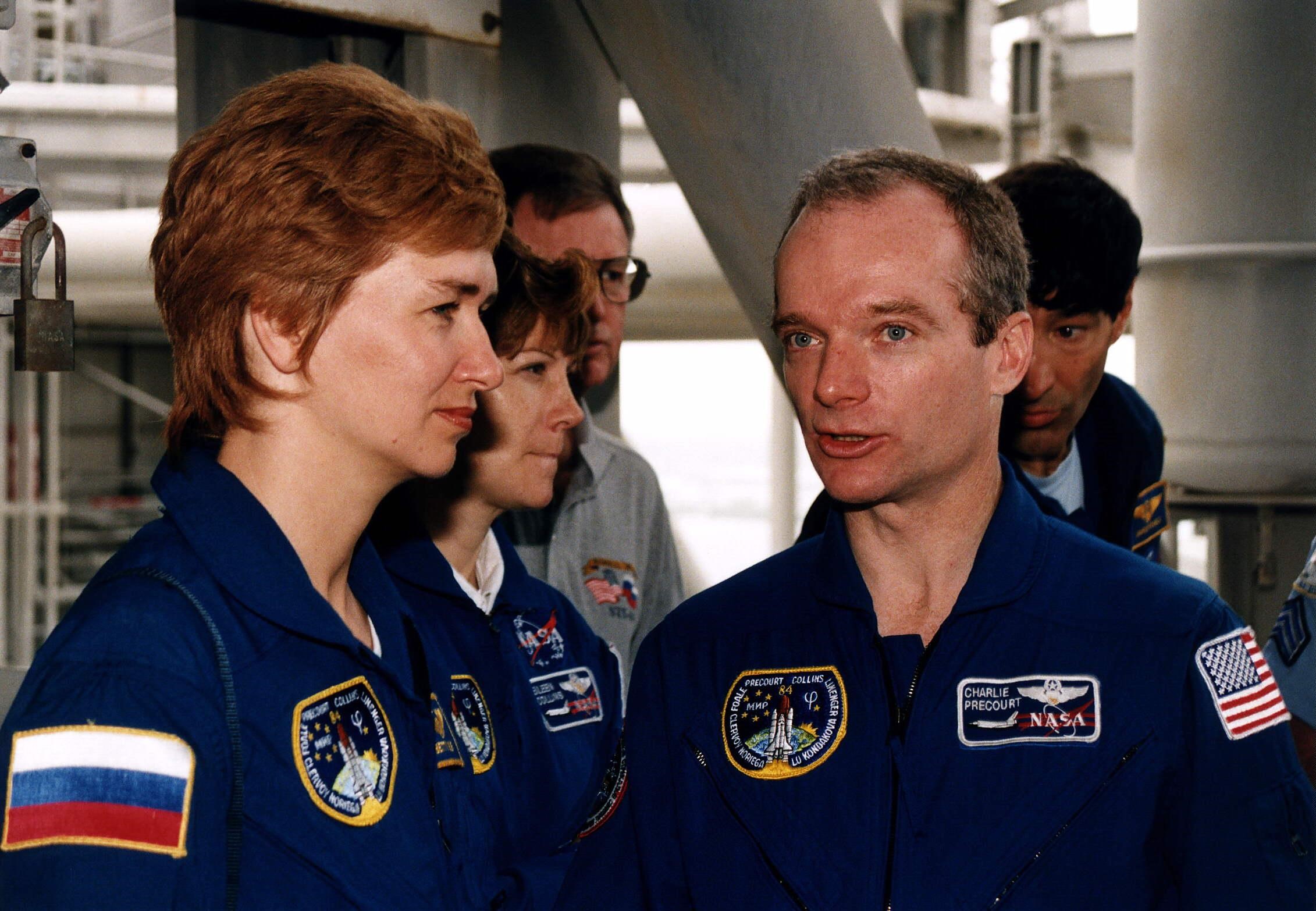 STS-84 Commander Charles J. Precourt, in right foreground, talks to fellow crew members, Mission Specialist Elena V. Kondakova, in left foreground, of the Russian Space Agency, and Pilot Eileen Marie Collins during Terminal Countdown Demonstration Test (TCDT) activities at Launch Pad 39A. In the background are NASA suit technician Al Rochford, at left, and astronaut Mario Runco Jr., who is assisting the STS-84 crew. STS-84 will be the sixth docking of the Space Shuttle with the Russian Space Station Mir. After docking, STS-84 Mission Specialist Michael C. Foale will transfer to the space station and become a member of the Mir 23 crew, replacing U.S. astronaut Jerry M. Linenger, who will return to Earth aboard Atlantis. Foale will live and work on Mir until mid-September when his replacement is expected to arrive on the STS-86 mission. STS-84 is targeted for a May 15 liftoff