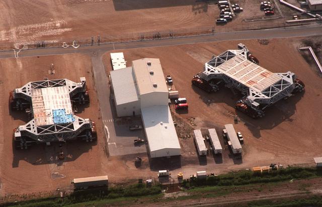 In this aerial view the Crawler Transporter Maintenance Building (center) sits between two crawler transporters. The KSC crawlers are the largest tracked vehicles known. Once used to move assembled Apollo/Saturn from the VAB to the launch pad, they are now used for transporting Shuttle vehicles. They move the Mobile Launcher Platform into the Vehicle Assembly Building and then to the Launch Pad with an assembled space vehicle. Maximum speed is 1.6 km (one mile) per hour loaded, about 3.2 km (2 miles) per hour unloaded. Launch Pad to VAB trip time with the Mobile Launch Platform is about 5 hours. The crawler burns 568 liters (150 gallons) of diesel oil per mile. KSC's two crawlers have accumulated 1,243 miles since 1977. Including the Apollo years, the transporters have racked up 2,526 miles, about the same distance as a one-way trip from KSC to Los Angeles by interstate highway or a round trip between KSC and New York City