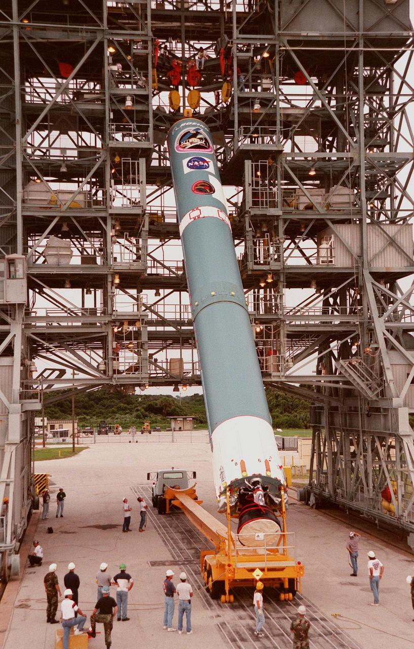The first stage of Boeing's Delta 7326 rocket, which will be used to launch the Deep Space 1 spacecraft, arrives at Pad 17A at Cape Canaveral Air Station. Targeted for launch on Oct. 15, 1998, this first flight in NASA's New Millennium Program is designed to validate 12 new technologies for scientific space missions of the next century. Onboard experiments include an ion propulsion engine and software that tracks celestial bodies so the spacecraft can make its own navigation decisions without the intervention of ground controllers. Deep Space 1 will complete most of its mission objectives within the first two months but will also do a flyby of a near-Earth asteroid, 1992 KD, in July 1999