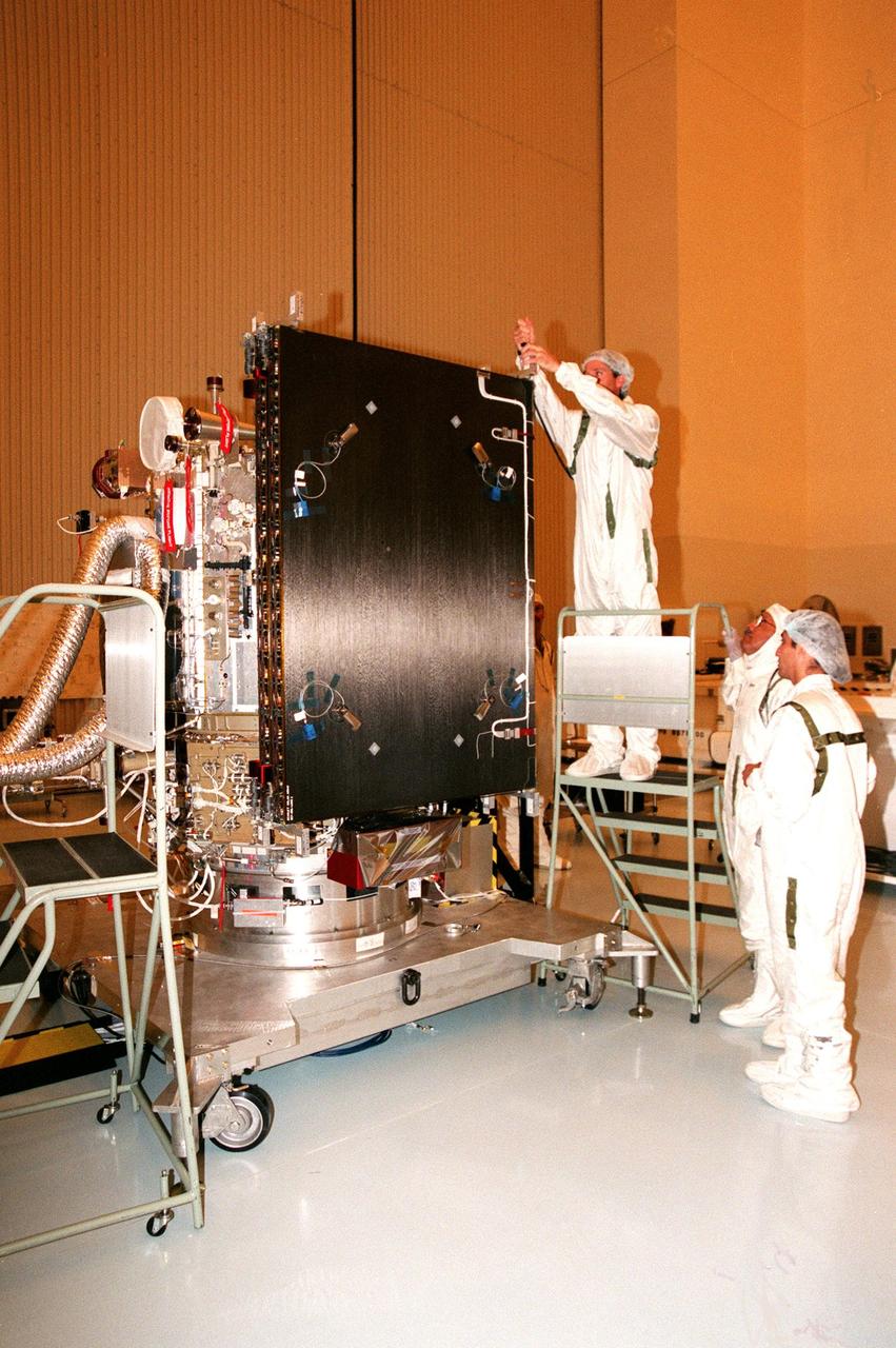 KENNEDY SPACE CENTER, FLA. -- Workers in the Payload Hazardous Servicing Facility (PHSF) attach a solar panel to Deep Space 1. The payload is scheduled to fly on the Boeing Delta 7326 rocket to be launched in October. The first flight in NASA's New Millennium Program, Deep Space 1 is designed to validate 12 new technologies for scientific space missions of the next century. Onboard experiments include an ion propulsion engine and software that tracks celestial bodies so the spacecraft can make its own navigation decisions without the intervention of ground controllers. Deep Space 1 will complete most of its mission objectives within the first two months, but will also do a flyby of a near-Earth asteroid, 1992 KD, in July 1999