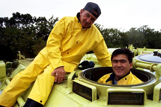 STS-89 Mission Specialist Salizhan Sharipov of the Russian Space Agency gets ready to drive the M-113 armored personnel carrier as part of Terminal Countdown Demonstration Test (TCDT) activities while George Hoggard, a training officer with KSC Fire Services, sits atop the vehicle. The TCDT is held at KSC prior to each Space Shuttle flight to provide crews with an opportunity to participate in simulated countdown activities. The STS-89 mission will be the eighth docking of the Space Shuttle with the Russian Space Station Mir. After docking, STS-89 Mission Specialist Andrew Thomas, Ph.D., will transfer to the space station, succeeding David Wolf, M.D., who will return to Earth aboard Endeavour. Dr. Thomas will live and work on Mir until June. STS-89 is scheduled for a Jan. 22 liftoff at 9:48 p.m