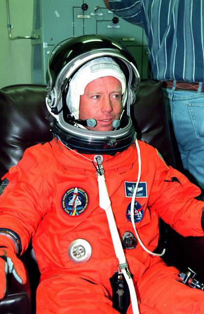 STS-95 Pilot Steven W. Lindsey suits up in the Operations and Checkout Building prior to his trip to Launch Pad 39-B. Lindsey and the rest of the STS-95 crew are at KSC to participate in the Terminal Countdown Demonstration Test (TCDT) which includes mission familiarization activities, emergency egress training, and a simulated main engine cutoff. The other crew members are Payload Specialist Chiaki Mukai (M.D., Ph.D.), representing the National Space Development Agency of Japan (NASDA), Mission Specialist Scott E. Parazynski, Mission Specialist Stephen K. Robinson, Mission Specialist Pedro Duque of Spain, representing the European Space Agency (ESA), Payload Specialist John H. Glenn Jr., senator from Ohio, and Mission Commander Curtis L. Brown. The STS-95 mission, targeted for liftoff on Oct. 29, includes research payloads such as the Spartan solar-observing deployable spacecraft, the Hubble Space Telescope Orbital Systems Test Platform, the International Extreme Ultraviolet Hitchhiker, as well as the SPACEHAB single module with experiments on space flight and the aging process. Following the TCDT, the crew will be returning to Houston for final flight preparations