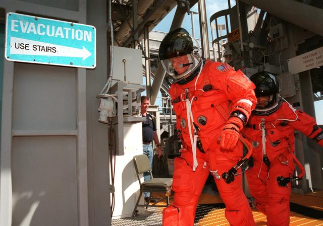 STS-95 Payload Specialists John H. Glenn Jr. (left), senator from Ohio, and Chiaki Mukai (M.D., Ph.D.) (right), representing the National Space Development Agency of Japan (NASDA), hurry toward the basket at the 195-foot level of Launch Pad 39B during an emergency egress exercise. Glenn and Mukai, along with other crew members, are at KSC to participate in the Terminal Countdown Demonstration Test (TCDT) which includes mission familiarization activities, emergency egress training, and a simulated main engine cutoff. The other crew members are Pilot Steven W. Lindsey, Mission Specialist Scott E. Parazynski, Mission Specialist Pedro Duque of Spain, representing the European Space Agency (ESA), Mission Specialist Stephen K. Robinson, and Mission Commander Curtis L. Brown. The STS-95 mission, targeted for liftoff on Oct. 29, includes research payloads such as the Spartan solar-observing deployable spacecraft, the Hubble Space Telescope Orbital Systems Test Platform, the International Extreme Ultraviolet Hitchhiker, as well as the SPACEHAB single module with experiments on space flight and the aging process. Following the TCDT, the crew will be returning to Houston for final flight preparations