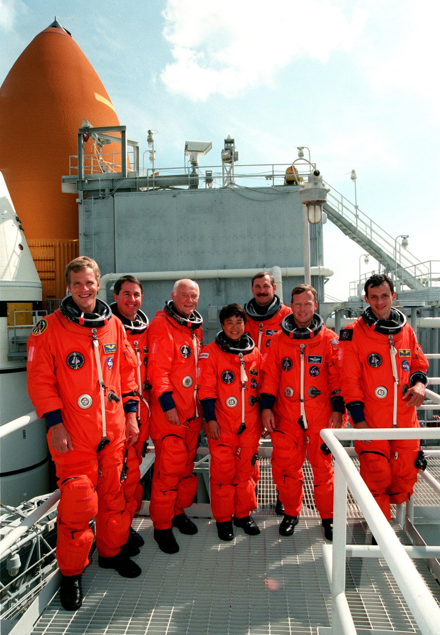 On Launch Pad 39B, the STS-95 crew pose after successfully completing a pre-launch countdown exercise on Space Shuttle Discovery. Standing from left to right are Mission Specialist Scott E. Parazynski, Mission Specialist Stephen K. Robinson, Payload Specialist John H. Glenn Jr., senator from Ohio, Payload Specialist Chiaki Mukai (M.D., Ph.D.), representing the National Space Development Agency in Japan (NASDA), Mission Commander Curtis L. Brown, Pilot Steven W. Lindsey, and Mission Specialist Pedro Duque of Spain, representing the European Space Agency (ESA). In the background (left) can be seen one of the solid rocket boosters and the external tank. The STS-95 crew are at KSC to participate in the Terminal Countdown Demonstration Test (TCDT) which includes mission familiarization activities, emergency egress training, and a simulated main engine cutoff. The STS-95 mission, targeted for liftoff on Oct. 29, includes research payloads such as the Spartan solar-observing deployable spacecraft, the Hubble Space Telescope Orbital Systems Test Platform, the International Extreme Ultraviolet Hitchhiker, as well as the SPACEHAB single module with experiments on space flight and the aging process. Following the TCDT, the crew will be returning to Houston for final flight preparations