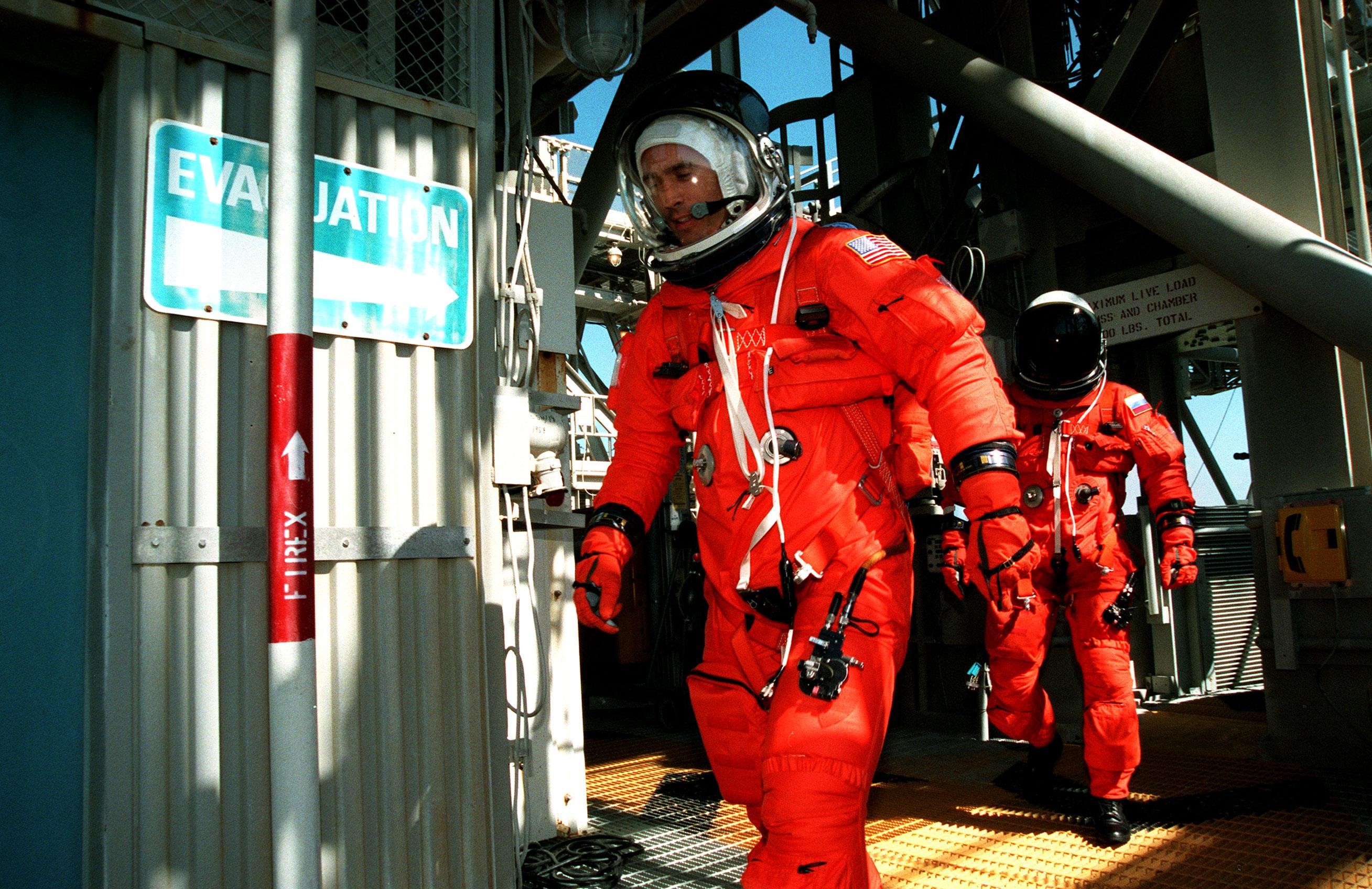 KENNEDY SPACE CENTER, Fla. -- STS-88 Mission Specialists James H. Newman (left) and Sergei Konstantinovich Krikalev (right) hurry toward the slidewire basket at the 195-foot level of Launch Pad 39A during an emergency egress exercise. The crew are at KSC to participate in the Terminal Countdown Demonstration Test (TCDT) which includes mission familiarization activities, emergency egress training, and the simulated main engine cut-off exercise. Mission STS-88 is targeted for launch on Dec. 3, 1998. It is the first U.S. flight for the assembly of the International Space Station and will carry the Unity connecting module. Unity will be mated with the already orbiting Russian-built Zarya control module. The 12-day mission includes three planned spacewalks to connect power, data and utility lines and install exterior equipment