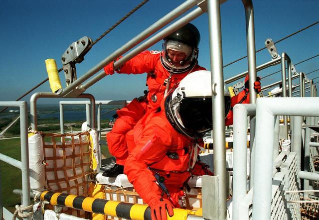 KENNEDY SPACE CENTER, Fla. -- STS-88 Mission Specialist Jerry L. Ross (left) climbs into slideware basket behind Mission Specialist Nancy Jane Currie, Ph.D., (right) at Launch Pad 39A as part of an emergency egress exercise. The crew are at KSC to participate in the Terminal Countdown Demonstration Test (TCDT) which includes mission familiarization activities, emergency egress training, and the simulated main engine cut-off exercise. Mission STS-88 is targeted for launch on Dec. 3, 1998. It is the first U.S. flight for the assembly of the International Space Station and will carry the Unity connecting module. Unity will be mated with the already orbiting Russian-built Zarya control module. The 12-day mission includes three planned spacewalks to connect power, data and utility lines and install exterior equipment