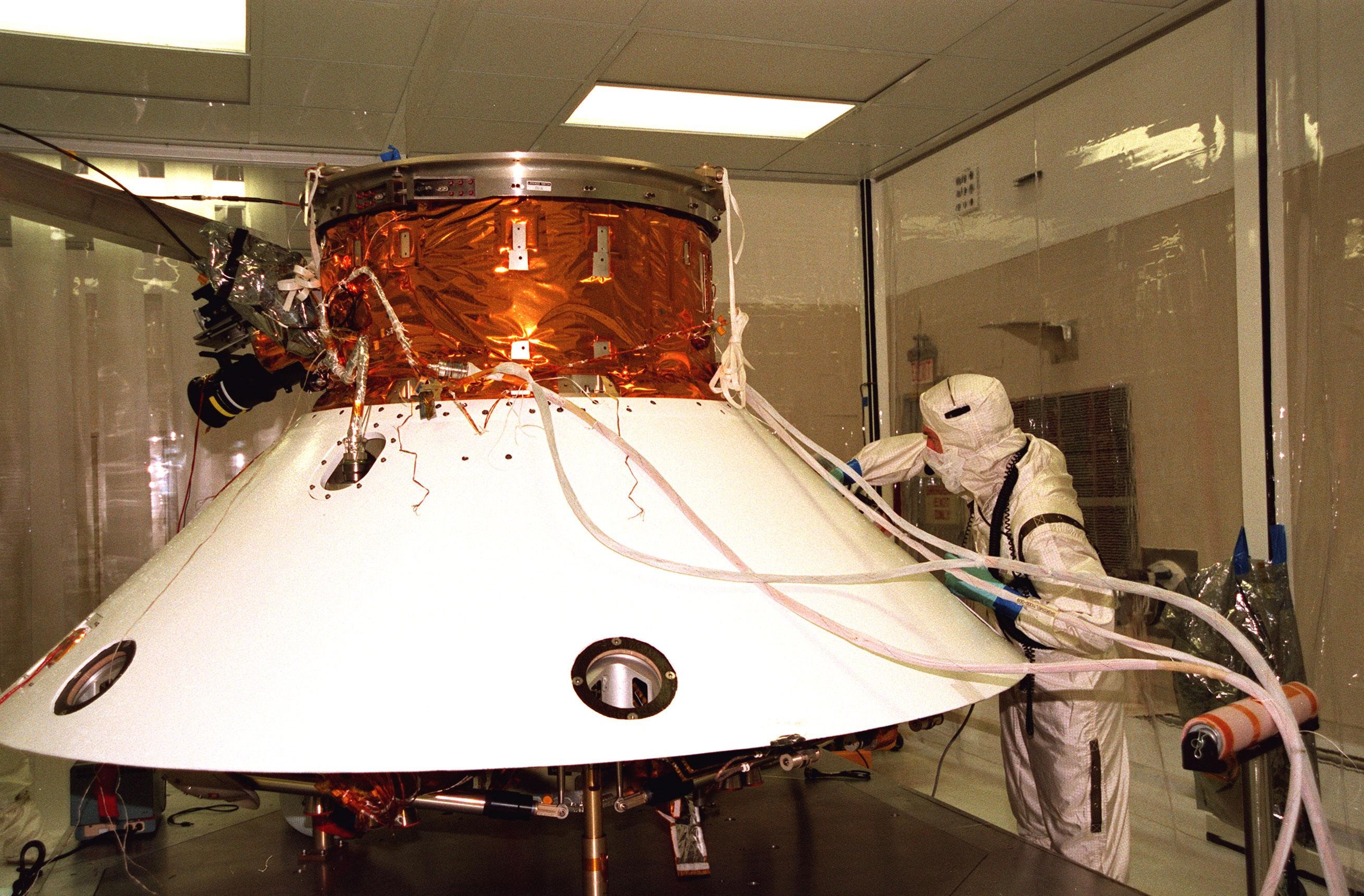KENNEDY SPACE CENTER, FLA. -- In the Spacecraft Assembly and Encapsulation Facility-2 (SAEF-2), a KSC technician takes part in testing science instruments and basic spacecraft subsystems on the Mars Polar Lander. The solar-powered spacecraft, targeted for launch from Cape Canaveral Air Station aboard a Delta II rocket on Jan. 3, 1999, is designed to touch down on the Martian surface near the northern-most boundary of the south pole in order to study the water cycle there. The lander also will help scientists learn more about climate change and current resources on Mars, studying such things as frost, dust, water vapor and condensates in the Martian atmosphere