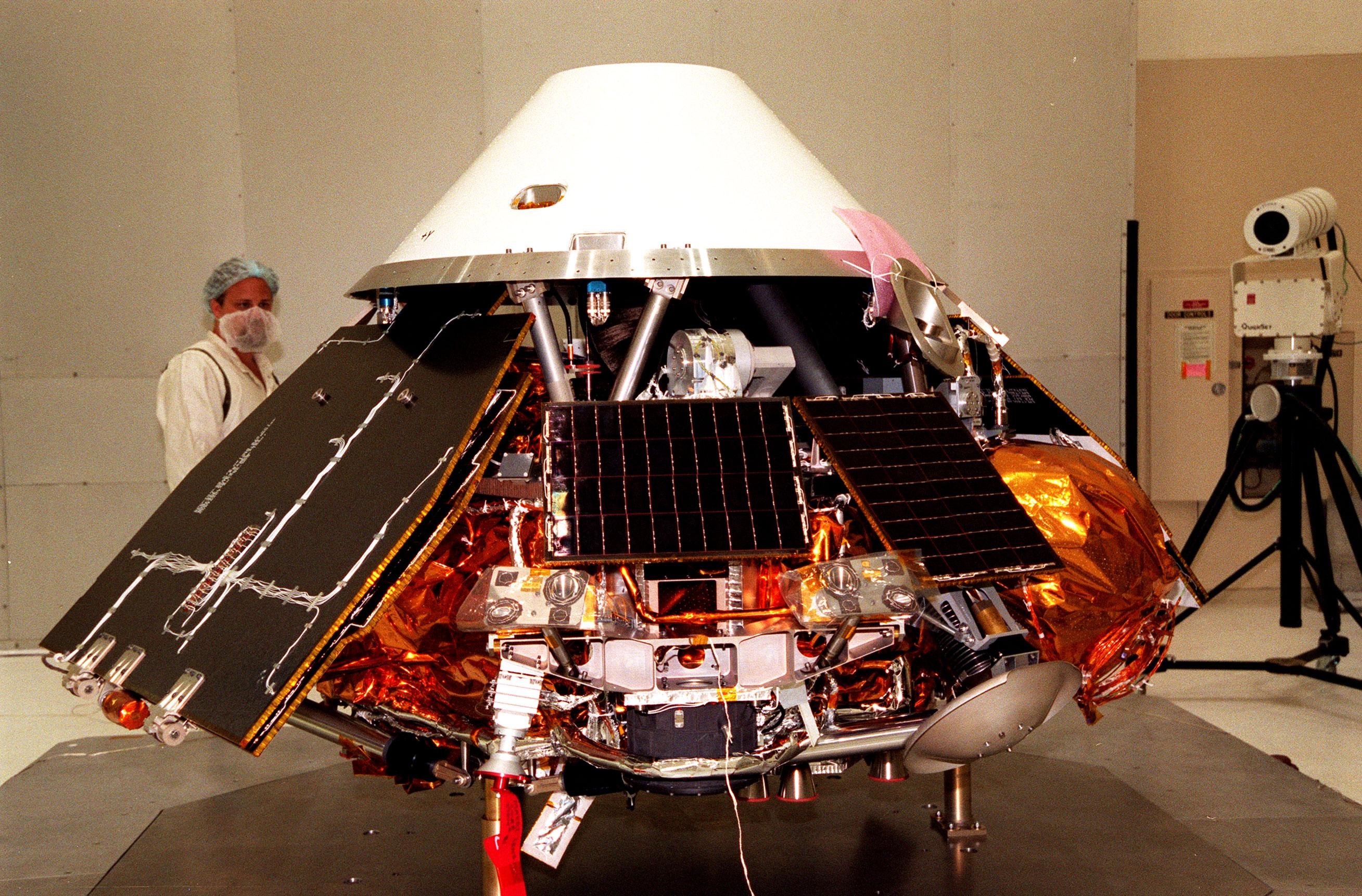 KENNEDY SPACE CENTER, FLA. -- In the Spacecraft Assembly and Encapsulation Facility-2 (SAEF-2), a KSC technician looks over the Mars Polar Lander before its encapsulation inside the backshell, a protective cover. The solar-powered spacecraft, targeted for launch from Cape Canaveral Air Station aboard a Delta II rocket on Jan. 3, 1999, is designed to touch down on the Martian surface near the northern-most boundary of the south pole in order to study the water cycle there. The lander also will help scientists learn more about climate change and current resources on Mars, studying such things as frost, dust, water vapor and condensates in the Martian atmosphere