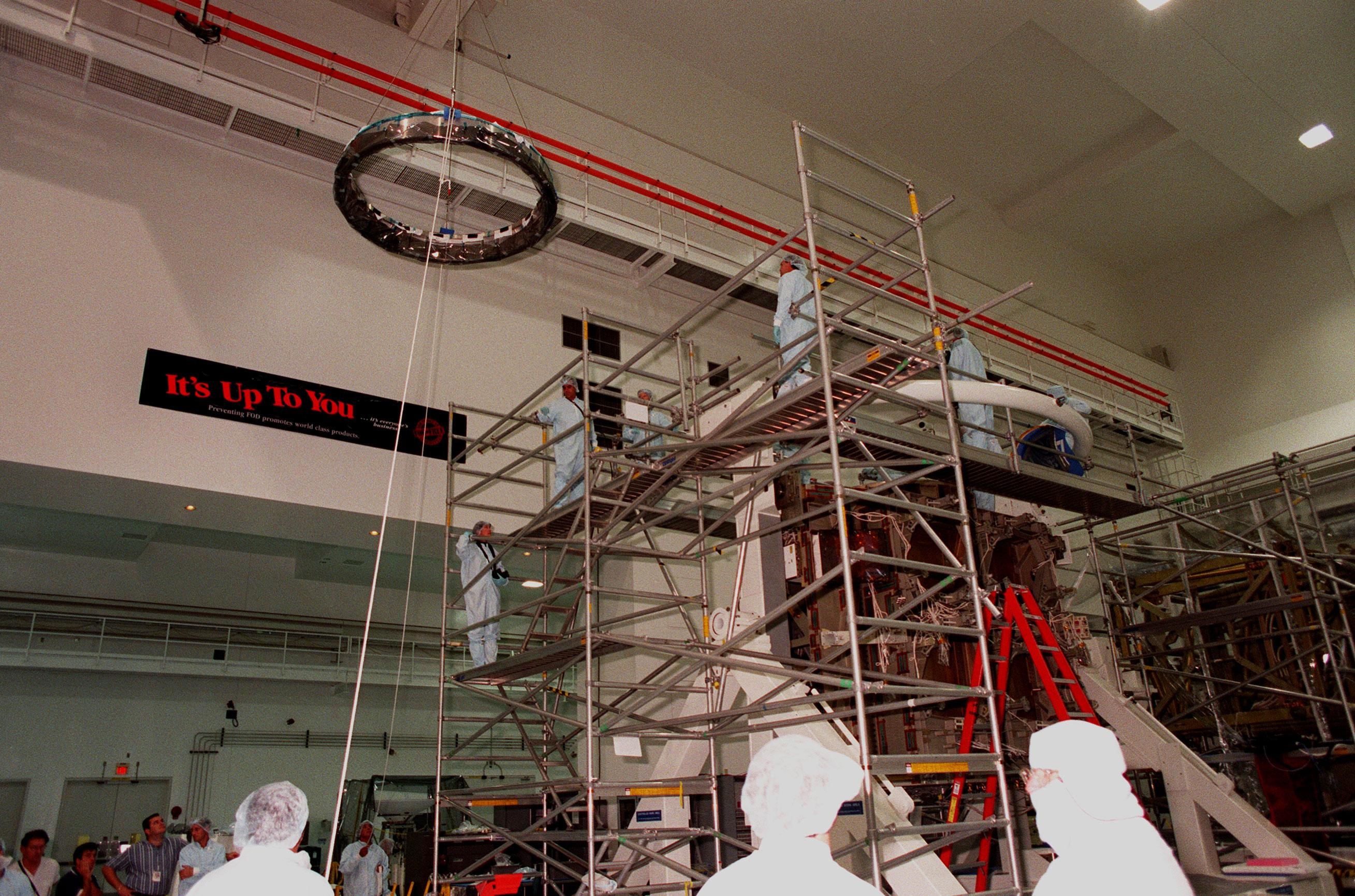 Workers in the Space Station Processing Facility watch the Passive Common Berthing Mechanism (PCBM) lifted high to move it over to the Z1 integrated truss structure at right. It will be mated to the Z1 truss, a component of the International Space Station (ISS). The Z1 truss will be used for the temporary installation of the P6 truss segment to the Unity connecting module. The P6 truss segment contains the solar arrays and batteries which will provide early station power. The truss is scheduled to be launched aboard STS-92 in late 1999