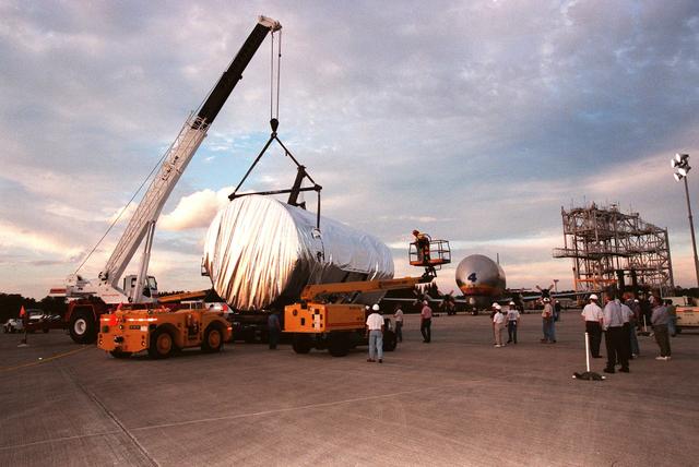 KENNEDY SPACE CENTER, FLA. -- A crane is attached to the U.S. laboratory module in order to transfer it to a truck. Intended for the International Space Station, the lab is being moved to the Space Station Processing Facility for pre-launch preparations. Scheduled for launch aboard the Shuttle Endeavour on mission STS-98, the laboratory comprises three cylindrical sections with two end cones. Each end-cone contains a hatch opening for entering and exiting the lab. The lab will provide a shirtsleeve environment for research in the areas of life science, microgravity science, Earth science and space science. Designated Flight 5A, this mission is targeted for launch in early 2000