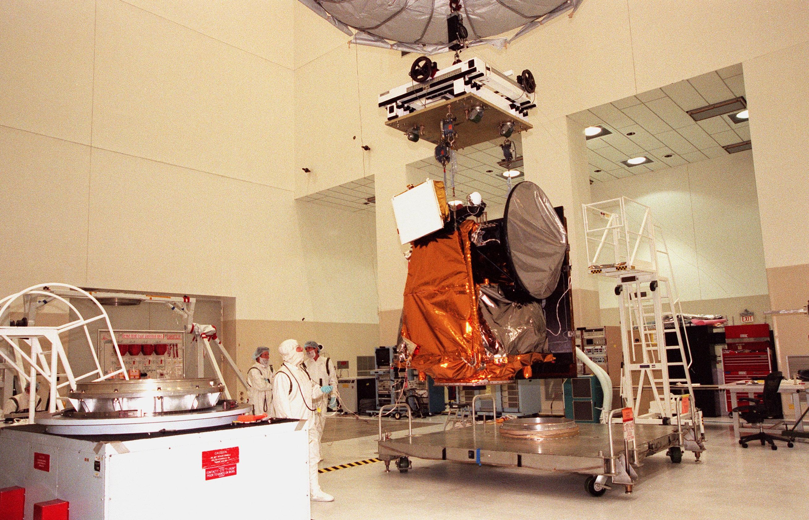 KENNEDY SPACE CENTER, FLA. -- In the Spacecraft Assembly and Encapsulation Facility -2 (SAEF-2), the Mars Climate Orbiter is lifted from the workstand to move it to another site for a spin test. Targeted for launch aboard a Delta II rocket on Dec. 10, 1998, the orbiter is heading for Mars where it will primarily support its companion Mars Polar Lander spacecraft, which is planned for launch on Jan. 3, 1999. The orbiter's instruments will monitor the Martian atmosphere and image the planet's surface on a daily basis for 687 Earth days. It will observe the appearance and movement of atmospheric dust and water vapor, as well as characterize seasonal changes on the surface. The detailed images of the surface features will provide important clues to the planet's early climate history and give scientists more information about possible liquid water reserves beneath the surface