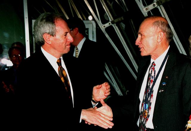 In the firing room of the Launch Control Center after the successful launch of Space Shuttle Endeavour at 3:35:34 a.m. EST, NASA Administrator Daniel Goldin congratulates KSC Director of Shuttle Operations Robert B. Sieck, who is wearing around his neck the Distinguished Service Medal just presented him. Goldin conferred the medal, the highest honor NASA gives a government employee, which recognizes someone who has personally made a contribution representing substantial and extraordinary progress to the mission of NASA