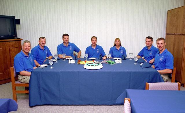 KENNEDY SPACE CENTER, FLA. -- The STS-90 flight crew enjoy the traditional pre-liftoff breakfast in the crew quarters of the Operations and Checkout Building. They are, from left, Payload Specialist Jay Buckey, M.D., Mission Specialist Dafydd (Dave) Williams, M.D., with the Canadian Space Agency, Pilot Scott Altman, Commander Richard Searfoss, Mission Specialist Kathryn (Kay) Hire, Mission Specialist Richard Linnehan, D.V.M., and Payload Specialist James Pawelczyk, Ph.D. After a weather briefing, the flight crew will be fitted with their launch and entry suits and depart for Launch Pad 39B. Once there, they will take their positions in the crew cabin of the Space Shuttle Columbia to await liftoff during a two-and-a-half-hour window that will open at 2:19 p.m. EDT, Apr. 17. STS-90 is the launch of Neurolab, a nearly 17-day mission to examine the effects of spaceflight on the brain, spinal cord, peripheral nerves and sensory organs in the human body