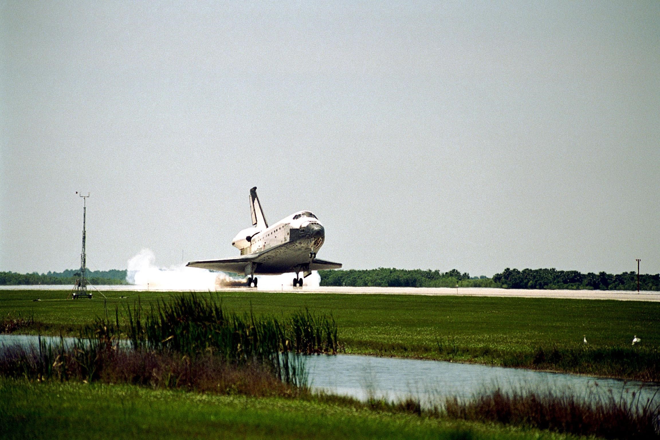 The orbiter Columbia touches down on Runway 33 of KSC's Shuttle Landing Facility to complete the nearly 16-day STS-90 mission. Main gear touchdown was at 12:08:59 p.m. EDT on May 3, 1998, landing on orbit 256 of the mission. The wheels stopped at 12:09:58 EDT, completing a total mission time of 15 days, 21 hours, 50 minutes and 58 seconds. The 90th Shuttle mission was Columbia's 13th landing at the space center and the 43rd KSC landing in the history of the Space Shuttle program. During the mission, the crew conducted research to contribute to a better understanding of the human nervous system. The crew of the STS-90 Neurolab mission include Commander Richard Searfoss; Pilot Scott Altman; Mission Specialists Richard Linnehan, D.V.M., Dafydd (Dave) Williams, M.D., with the Canadian Space Agency, and Kathryn (Kay) Hire; and Payload Specialists Jay Buckey, M.D., and James Pawelczyk, Ph.D