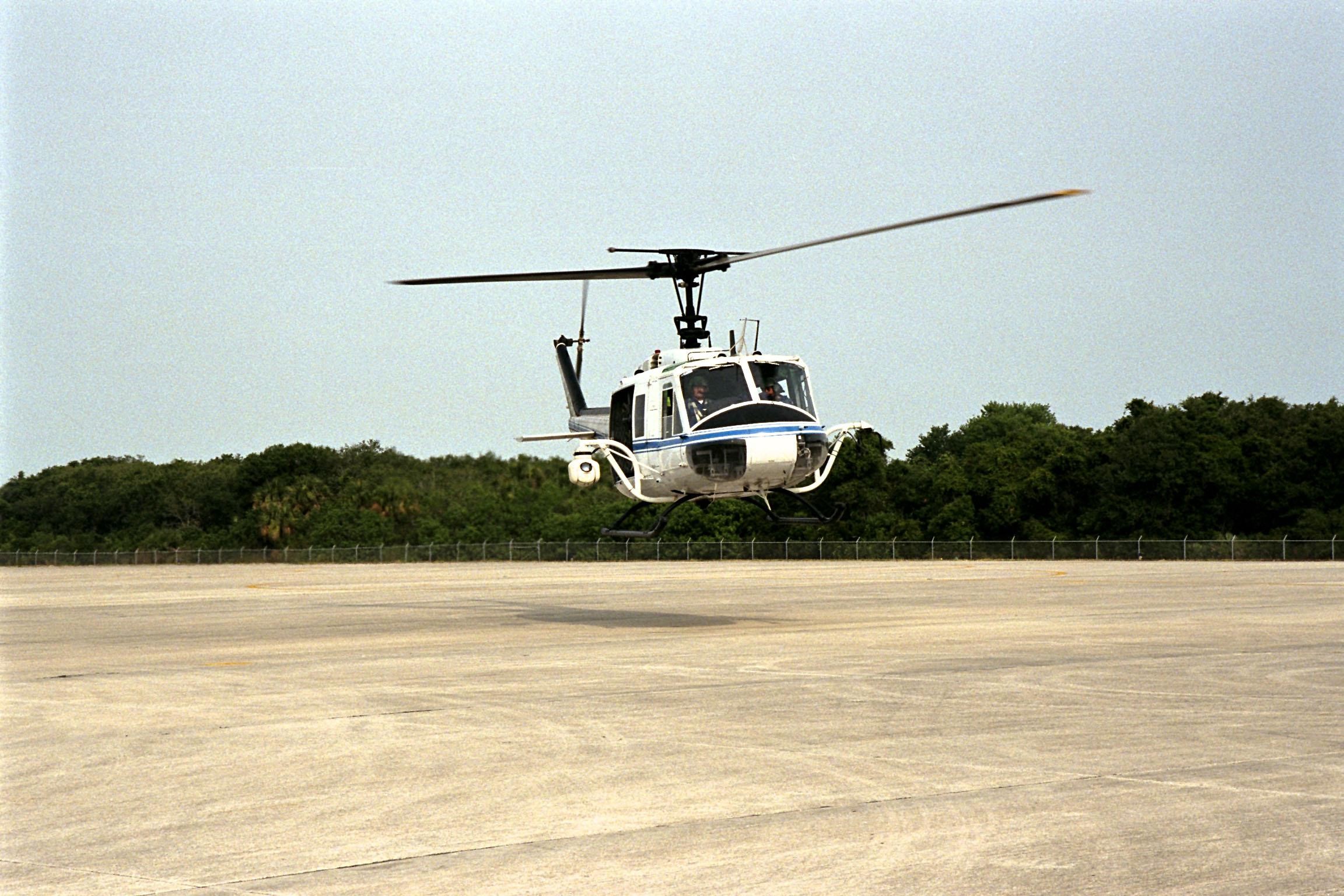 KENNEDY SPACE CENTER, FLA. -- NASA's Huey UH-1 helicopter lands at the Shuttle Landing Facility to pick up Kennedy Space Center (KSC) Security personnel who operate the Forward Looking Infrared Radar (FLIR) installed on board. The helicopter has also been outfitted with a portable global positioning satellite (GPS) system to support Florida's Division of Forestry as they fight the brush fires which have been plaguing the state as a result of extremely dry conditions and lightning storms. The FLIR includes a beach ball-sized infrared camera that is mounted on the helicopter's right siderail and a real-time television monitor and recorder installed inside. While the FLIR collects temperature data and images, the GPS system provides the exact coordinates of the fires being observed and transmits the data to the firefighters on the ground. KSC's security team routinely uses the FLIR equipment prior to Shuttle launch and landing activities to ensure that the area surrounding the launch pad and runway are clear of unauthorized personnel. KSC's Base Operations Contractor, EG&G Florida, operates the NASA-owned helicopter