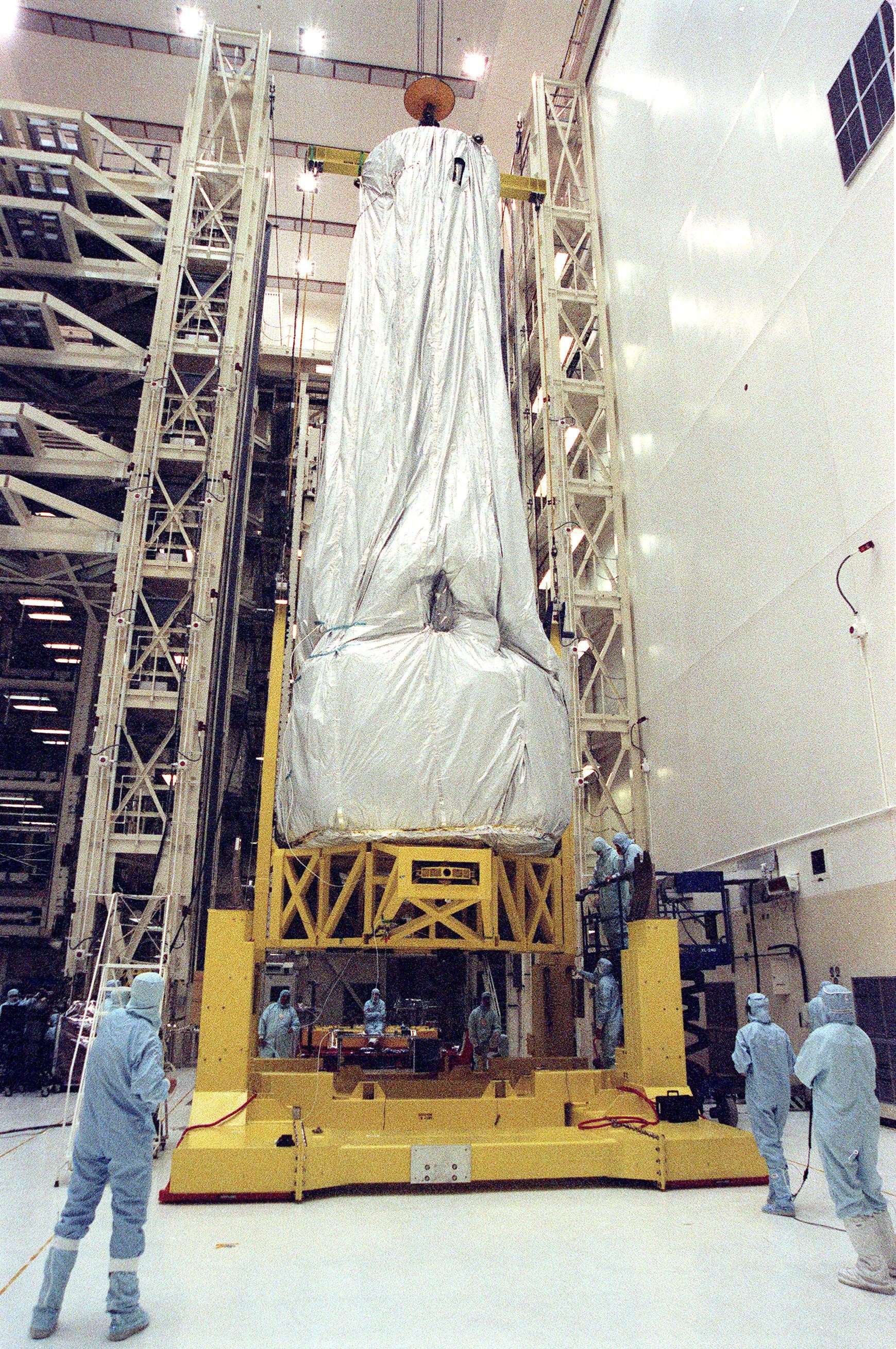 In the Vertical Processing Facility (VPF), workers move the shrouded Chandra X-ray Observatory on its workstand to the scaffolding behind it. The telescope will undergo final installation of associated electronic components; it will also be tested, fueled and mated with the Inertial Upper Stage booster. A set of integrated tests will follow. Chandra is scheduled for launch July 9 aboard Space Shuttle Columbia, on mission STS-93 . Formerly called the Advanced X-ray Astrophysics Facility, Chandra comprises three major elements: the spacecraft, the science instrument module (SIM), and the world's most powerful X-ray telescope. Chandra will allow scientists from around the world to see previously invisible black holes and high-temperature gas clouds, giving the observatory the potential to rewrite the books on the structure and evolution of our universe