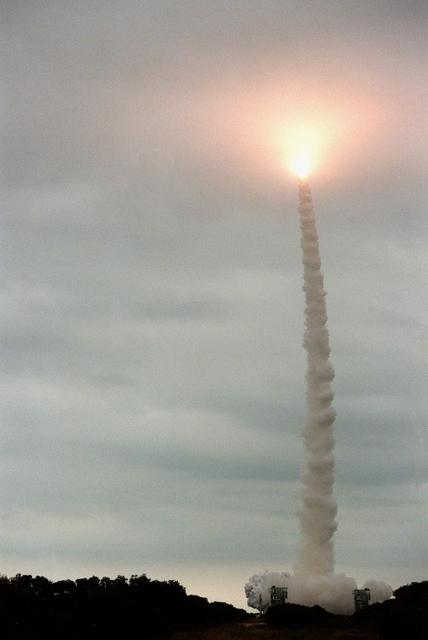 KENNEDY SPACE CENTER, FLA. -- Looking like a Roman candle, the exhaust from the Boeing Delta II rocket with the Mars Polar Lander aboard lights up the clouds as it hurtles skyward. The rocket was launched at 3:21:10 p.m. EST from Launch Complex 17B, Cape Canaveral Air Station. The lander is a solar-powered spacecraft designed to touch down on the Martian surface near the northern-most boundary of the south polar cap, which consists of carbon dioxide ice. The lander will study the polar water cycle, frosts, water vapor, condensates and dust in the Martian atmosphere. It is equipped with a robotic arm to dig beneath the layered terrain. In addition, Deep Space 2 microprobes, developed by NASA's New Millennium Program, are installed on the lander's cruise stage. After crashing into the planet's surface, they will conduct two days of soil and water experiments up to 1 meter (3 feet) below the Martian surface, testing new technologies for future planetary descent probes. The lander is the second spacecraft to be launched in a pair of Mars Surveyor '98 missions. The first is the Mars Climate Orbiter, which was launched aboard a Delta II rocket from Launch Complex 17A on Dec. 11, 1998.