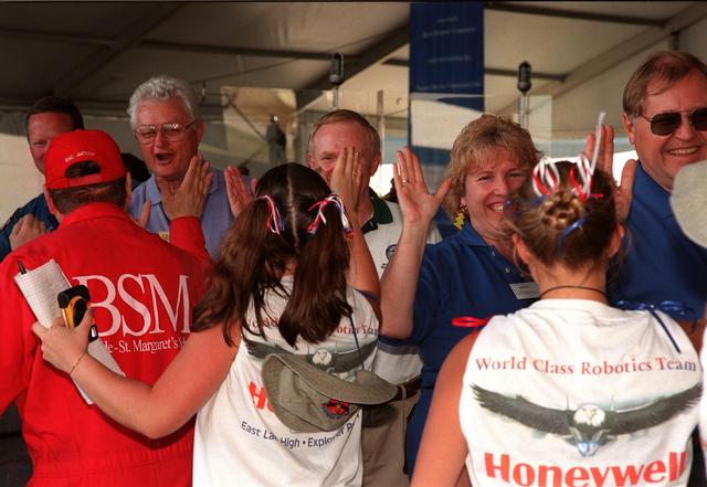 At the award ceremony for the 1999 FIRST Southeastern Regional robotic competition held at KSC, one of the winning teams, from Ocoee, Fla., is greeted by (left to right) astronaut David Brown, Deputy Director for Launch and Payload Processing Loren Shriver, Center Director Roy Bridges, and two unidentified judges. FIRST is a nonprofit organization, For Inspiration and Recognition of Science and Technology, that sponsors the event pitting gladiator robots against each other in an athletic-style competition. The FIRST robotics competition is designed to provide students with a hands-on, inside look at engineering and other professional careers, pairing high school students with engineer mentors and corporations. The regional event comprised 27 teams. Along with the championship award, which went to high school teams from Miami and San German, Puerto Rico, 15 other awards were presented