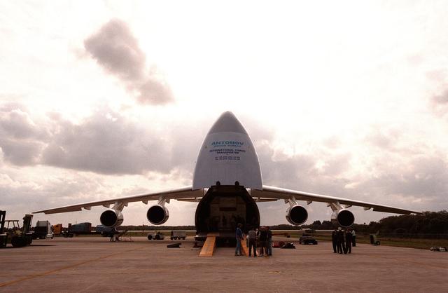 After delivering a French satellite for the EUTELSat Consortium, a Russian cargo plane, the Antonov 124, sits on the end of the Shuttle Landing Facility at KSC. The satellite is targeted to be launched April 12 aboard an Atlas IIAS rocket from Complex 36, Cape Canaveral Air Station