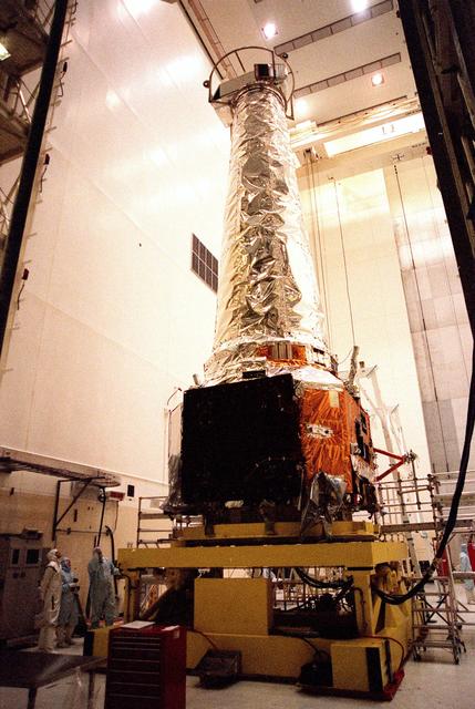 In the Vertical Processing Facility, STS-93 Pilot Jeffrey S. Ashby and Commander Eileen Collins join a TRW technician observing the Chandra X-ray Observatory on top of a work stand. Other members of the STS-93 crew who are at KSC for payload familiarization are Mission Specialists Catherine G. Coleman and Michel Tognini of France, who represents the Centre National d'Etudes Spatiales (CNES). Collins is the first woman to serve as a shuttle mission commander. She was the first woman pilot of a Space Shuttle, on mission STS-63, and also served as pilot on mission STS-84. The fifth member of the crew is Mission Specialist Steven A. Hawley. Chandra is scheduled for launch July 9 aboard Space Shuttle Columbia, on mission STS-93 . Formerly called the Advanced X-ray Astrophysics Facility, Chandra comprises three major elements: the spacecraft, the science instrument module (SIM), and the world's most powerful X-ray telescope. Chandra will allow scientists from around the world to see previously invisible black holes and high-temperature gas clouds, giving the observatory the potential to rewrite the books on the structure and evolution of our universe