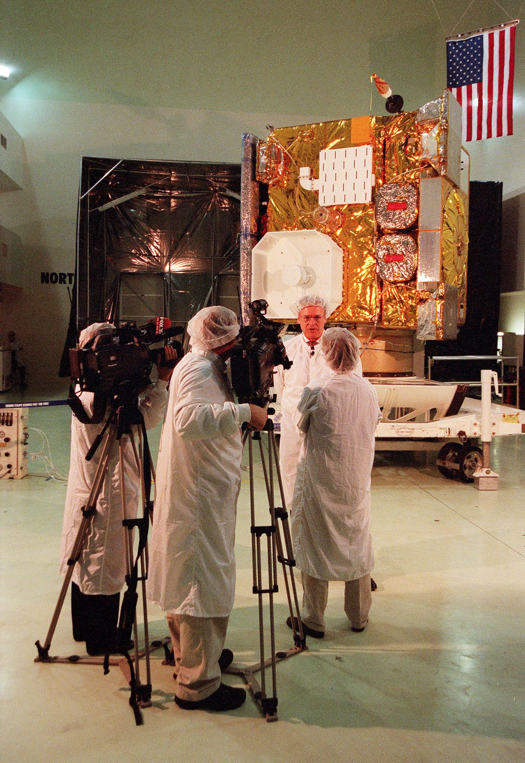 At Astrotech, in Titusville, Fla., GOES-L Program Manager Gerald Dittberner, with the National Oceanic and Atmospheric Administration (NOAA) talks with a journalist during a media showing of the GOES-L satellite in the background. The GOES-L is due to be launched May 15 from Launch Pad 36A aboard an Atlas IIA rocket. Once in orbit, the satellite will become GOES-11, joining GOES-8, GOES-9 and GOES-10 in space. The fourth of a new advanced series of geostationary weather satellites for the National Oceanic and Atmospheric Administration (NOAA), GOES-L is a three-axis inertially stabilized spacecraft that will provide pictures and perform atmospheric sounding at the same time. Once launched, the satellite will undergo checkout and then provide backup capabilities for the existing, aging operational satellites
