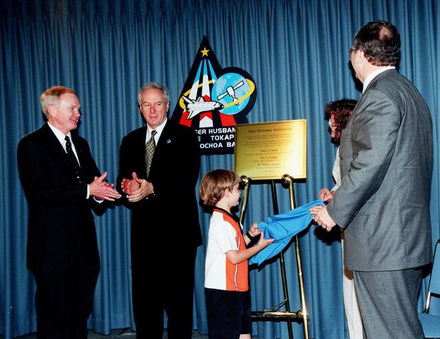 From left, Center Director Roy Bridges and NASA Administrator Daniel S. Goldin applaud as Jay Holliman, with the help of his mother, Mrs. Dianne Holliman, unveils a plaque honoring his father, the late John Holliman. At right is Tom Johnson, news group chairman of CNN. The occasion was the dedication of the KSC Press Site auditorium as the John Holliman Auditorium to honor the CNN national correspondent for his enthusiastic, dedicated coverage of America's space program. The auditorium was built in 1980 and has been the focal point for new coverage of Space Shuttle launches. The ceremony followed the 94th launch of a Space Shuttle, on mission STS-96, earlier this morning