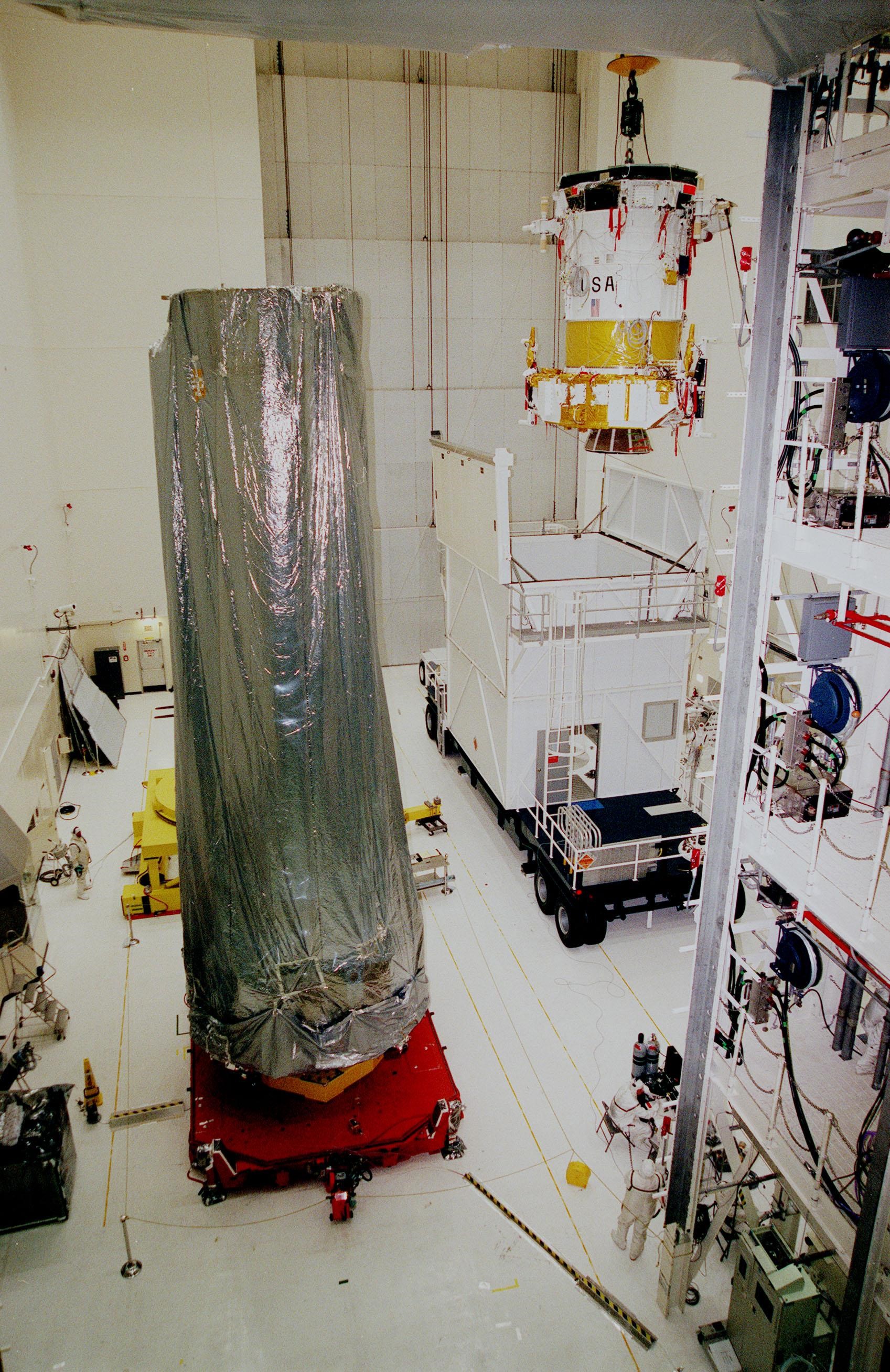 The Inertial Upper Stage (IUS) booster (right) is lifted out of its container after arriving at Kennedy Space Center's Vertical Processing Facility. The IUS will be mated with the Chandra X-ray Observatory (at left) and then undergo testing to validate the IUS/Chandra connections and check the orbiter avionics interfaces. Following that, an end-to-end test (ETE) will be conducted to verify the communications path to Chandra, commanding it as if it were in space. With the world's most powerful X-ray telescope, Chandra will allow scientists from around the world to see previously invisible black holes and high-temperature gas clouds, giving the observatory the potential to rewrite the books on the structure and evolution of our universe. Chandra is scheduled for launch July 22 aboard Space Shuttle Columbia, on mission STS-93