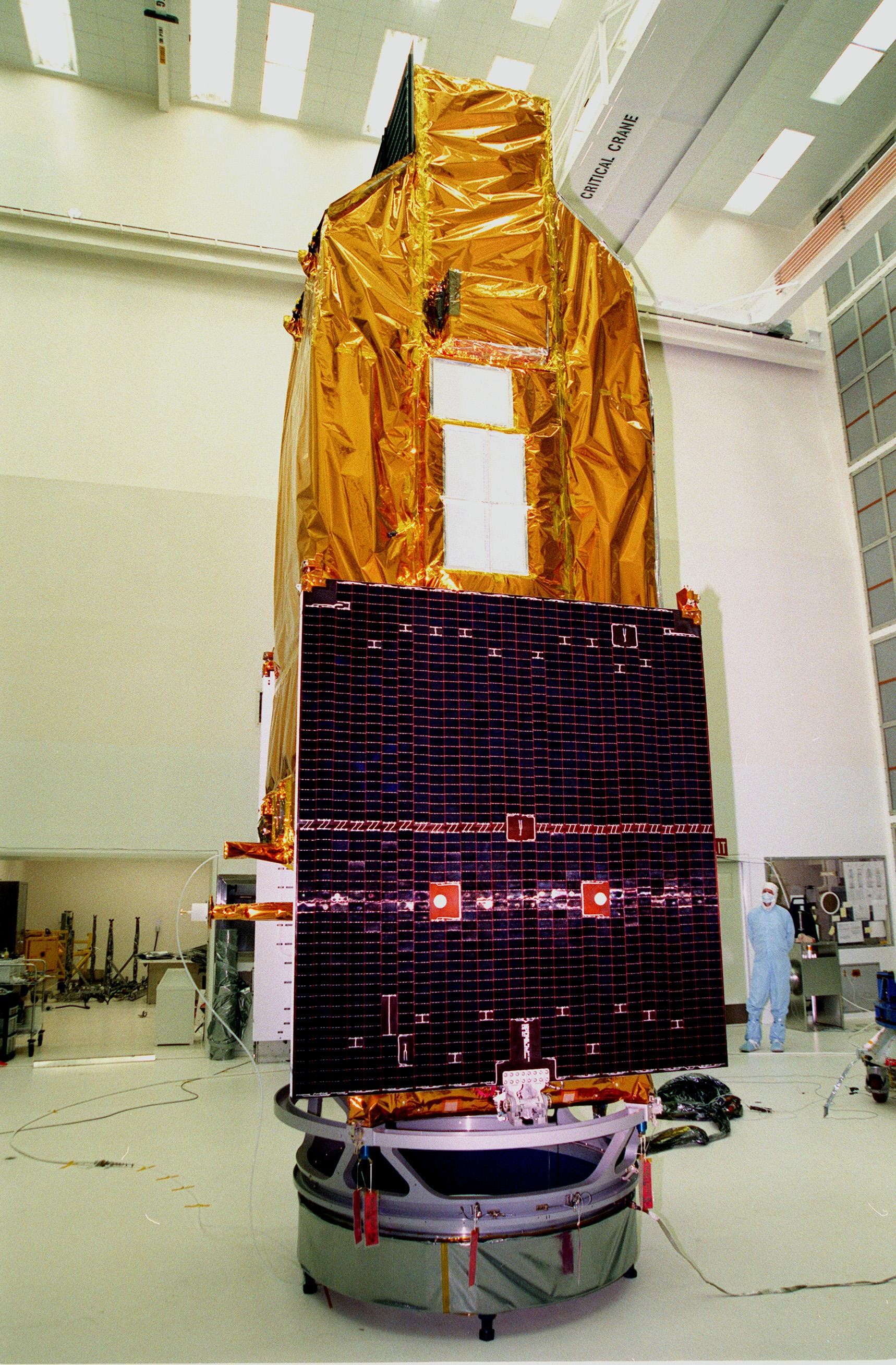 NASA's Far Ultraviolet Spectroscopic Explorer (FUSE) satellite stands in the Hangar A&E, Cape Canaveral Air Station (CCAS), ready for its launch, targeted for June 23 from Launch Pad 17A, CCAS aboard a Boeing Delta II rocket. FUSE was developed by The Johns Hopkins University under contract to Goddard Space Flight Center, Greenbelt, Md., to investigate the origin and evolution of the lightest elements in the universe hydrogen and deuterium. In addition, the FUSE satellite will examine the forces and process involved in the evolution of the galaxies, stars and planetary systems by investigating light in the far ultraviolet portion of the electromagnetic spectrum