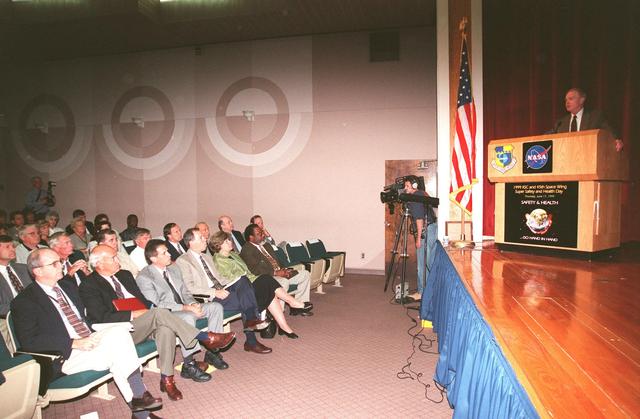Center Director Roy Bridges opens the second Super Safety and Health Day at Kennedy Space Center, an entire day when most normal work activities are suspended to allow personnel to attend safetyand health-related activities. The theme, "Safety and Health Go Hand in Hand," emphasized KSC's commitment to place the safety and health of the public, astronauts, employees and space-related resources first and foremost. Events included a keynote address, a panel session about related issues, vendor exhibits, and safety training in work groups. The keynote address and panel session were also broadcast internally over NASA television
