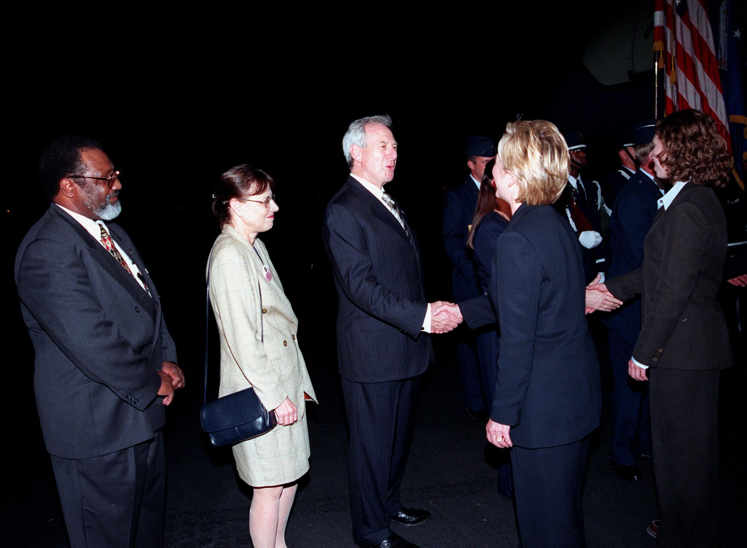 First Lady Hillary Rodham Clinton and her daughter, Chelsea, are greeted by NASA Administrator Daniel S. Goldin upon their arrival at the Skid Strip at Cape Canaveral Air Station. Next to Gold are (from left) Deputy Director for Business Operations Jim Jennings and Mrs. Goldin. Mrs. Clinton and Chelsea are here to view the launch of Space Shuttle mission STS-93, scheduled for 12:36 a.m. EDT July 20. Much attention has been generated over the launch due to Commander Eileen M. Collins, the first woman to serve as commander of a Shuttle mission. The primary payload of the five-day mission is the Chandra X-ray Observatory, which will allow scientists from around the world to study some of the most distant, powerful and dynamic objects in the universe. The new telescope is 20 to 50 times more sensitive than any previous X-ray telescope and is expected to unlock the secrets of supernovae, quasars and black holes