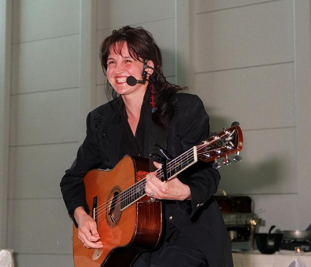 KENNEDY SPACE CENTER, FLA. -- At the Apollo/Saturn V Center, country music recording artist Teresa performs a song, "Brave New Girls," written for astronaut Catherine "Cady" Coleman, mission specialist on STS-93. She entertains participants and attendees of a women's forum held in the center. The attendees are planning to view the launch of STS-93 at the Banana Creek viewing sight. Much attention has been generated over the launch due to Commander Eileen M. Collins, the first woman to serve as commander of a Shuttle mission. Liftoff is scheduled for July 20 at 12:36 a.m. EDT