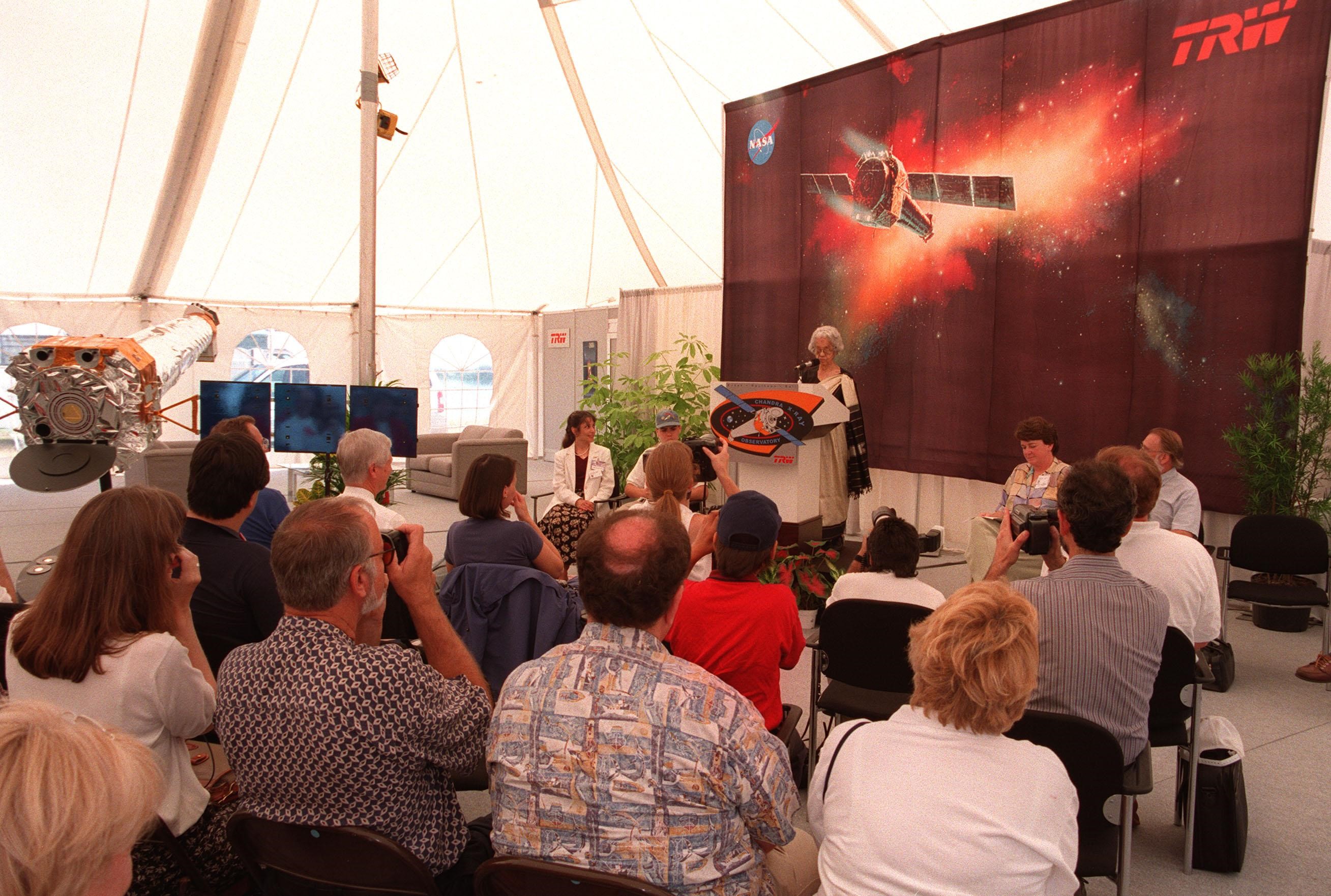 Mrs. Lalitha Chandrasekhar (at podium), wife of the late Indian-American Nobel Laureate Subrahmanyan Chandrasekhar, addresses the media and other invited guests in the TRW Media Hospitality Tent at the NASA Press Site at KSC. Other participants in the program (seated facing the audience, left to right) are the winners of the contest to rename the telescope, Jatila van der Veen, academic coordinator and lecturer, Physics Dept., University of Santa Barbara, Calif., and Tyrel Johnson, high school student, Laclede, Idaho; Joanne Maguire, vice-president and general manager, TRW Space & Laser Programs Division; and Dr. Alan Bunner, Science Program Director, Structure and Evolution of the Universe, Office of Space Science, NASA Headquarters, Washington, D.C. The name "Chandra," a shortened version of Chandrasekhar, was the name the Nobel Laureate preferred among friends and colleagues. "Chandra" also means "Moon" or "luminous" in Sanskrit. The observatory is scheduled to be launched aboard Columbia on Space Shuttle mission STS-93